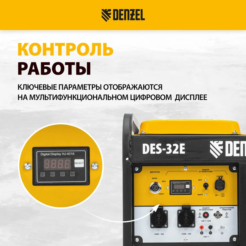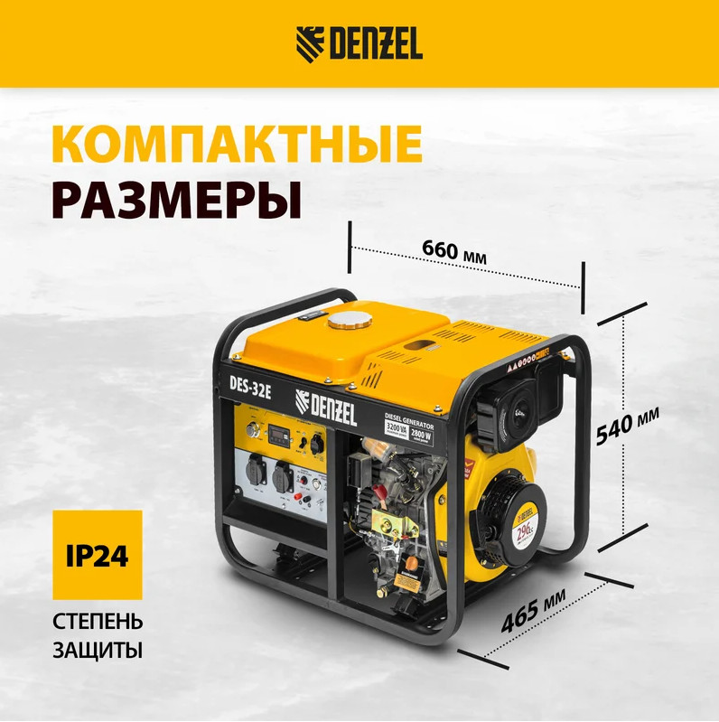 • Мобильность — к генератору можно приобрести транспортировочный комплект Denzel 94905 для перемещения по рабочей площадке