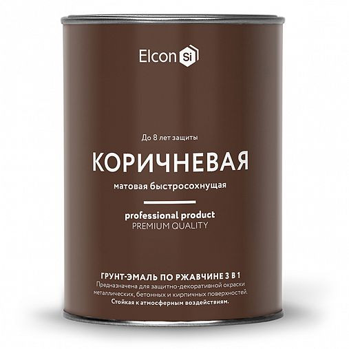 Elcon Быстросохнущая грунт-эмаль 3 в 1 по ржавчине/ краска по металлу коричневая предназначена для нанесения как на чистые, так и на пораженные коррозией металлические поверхности с целью создания надежной антикоррозионной защиты металлоконструкций, оборудования, металлических изделий. Грунт-эмаль 3 в 1 Elcon сочетает в себе функциональные свойства преобразователя ржавчины, антикоррозионного грунта и декоративной эмали. Области применения: - Металлические изделия - Садовая мебель - Ворота - Заборы - Двери - Теплицы - Светильники - Скамьи - Оборудование.