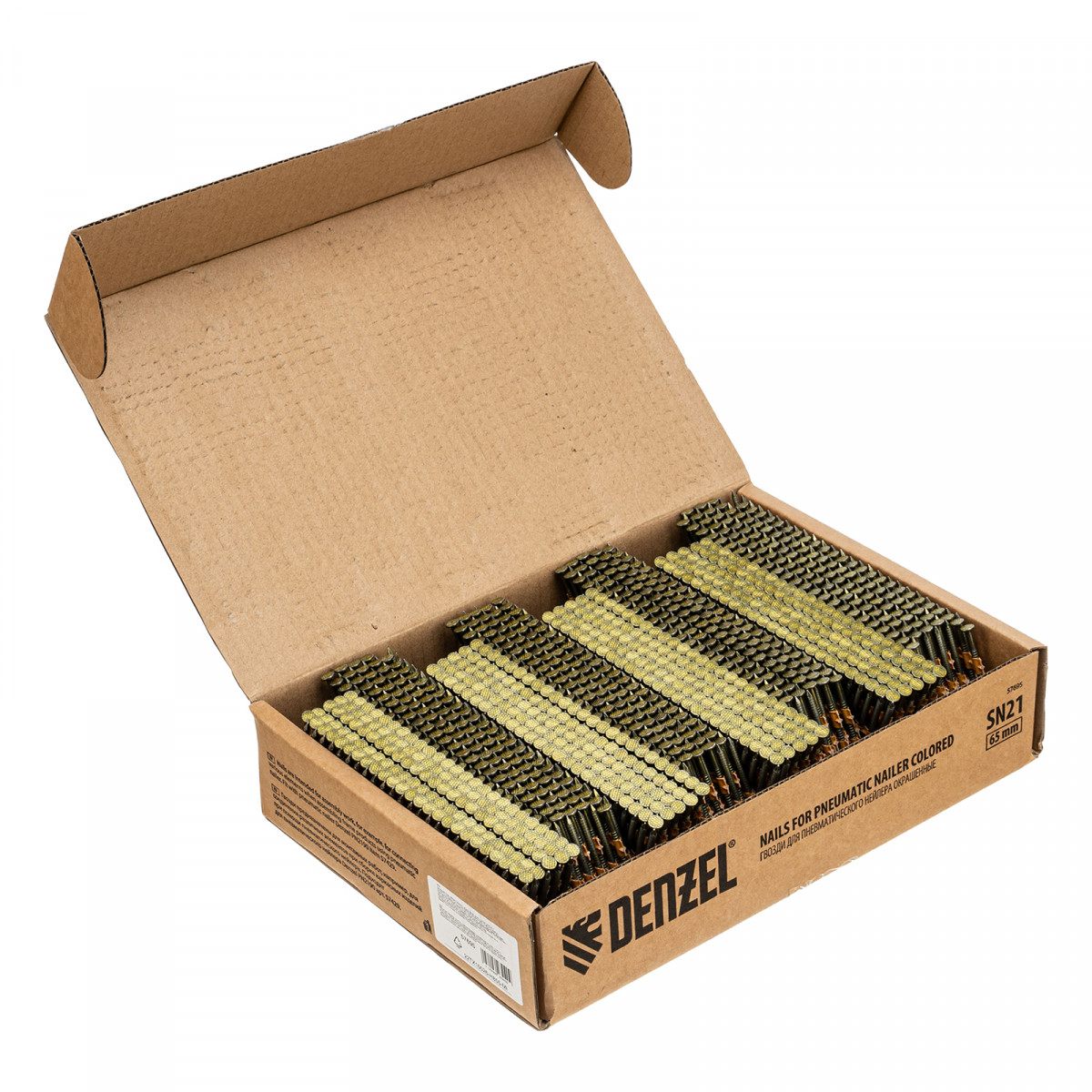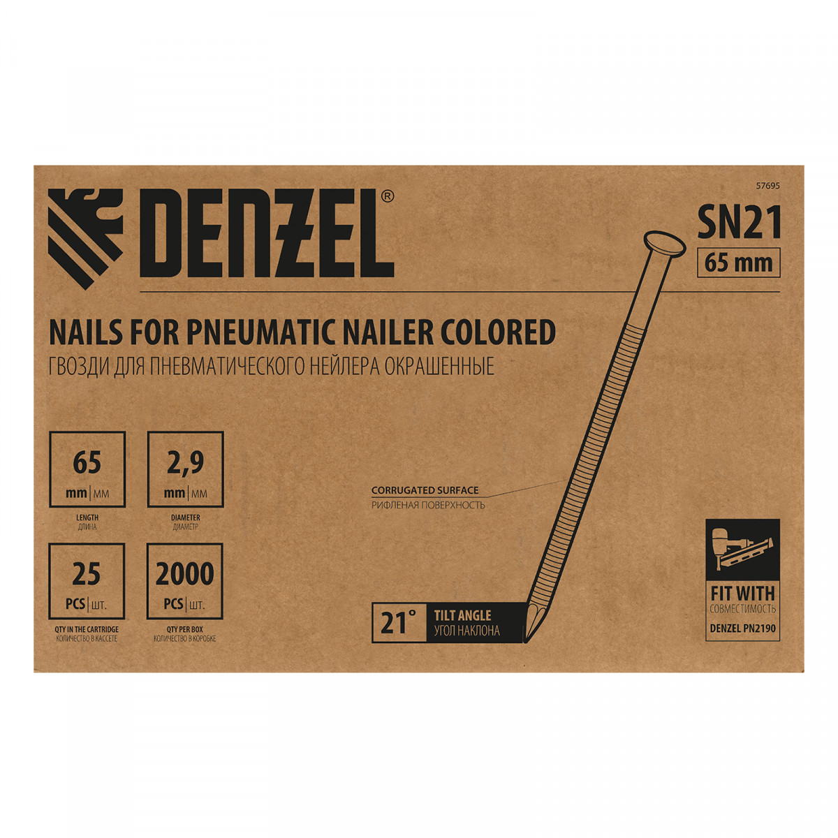 Гвозди Denzel 57695 типа SN21, длиной 65 мм и диаметром 2,9 мм, с крашеной поверхностью, 2000 шт. в упаковке, — расходники для пневматического нейлера. Используются для скрепления различных материалов, будут полезны во время сборочных и отделочных работ.