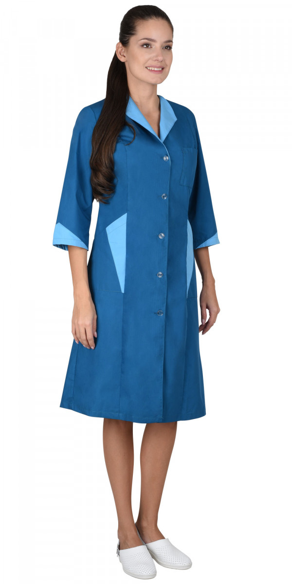 Халат полуприлегающего силуэта, слегка расширенный к низу. Застёжка на пуговицы, рельефы. Воротник, часть нижних карманов и низ рукавов 3/4 из отделочной ткани.