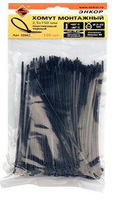 Хомут пластиковый 2.5Х150 черный Энкор (100 шт)