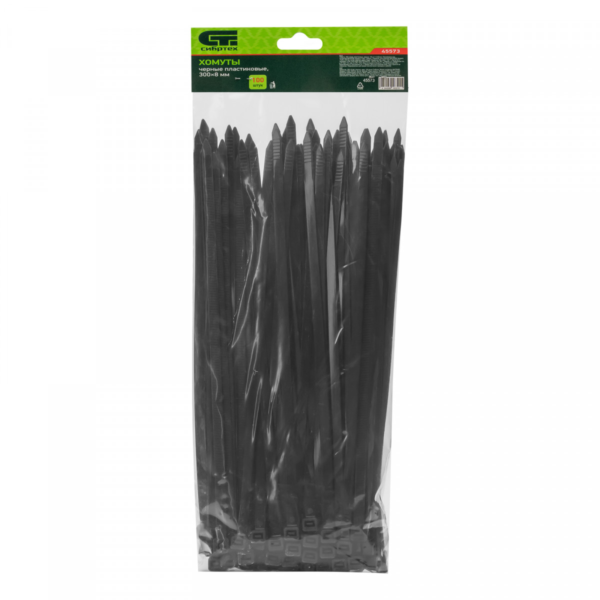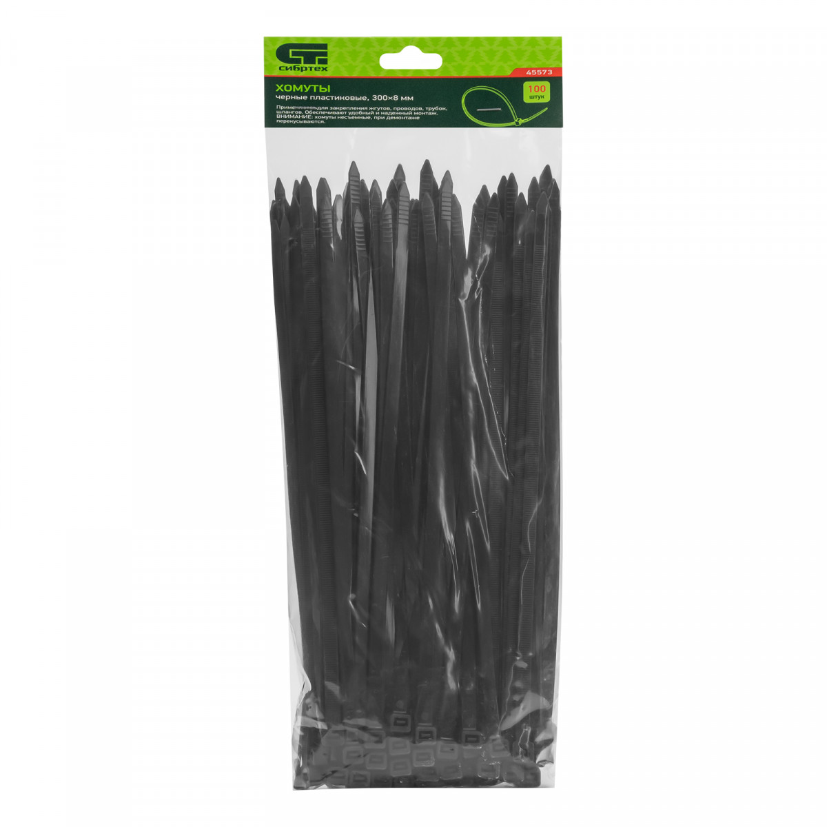 Черные пластиковые хомуты Сибртех 45573, 300 х 8 мм, 100 шт. в упаковке, используются для стяжки кабелей, закрепления трубок, шлангов, рекламных конструкций, а также для упаковки различных предметов. Пригодятся во время прокладки электрических и локальных вычислительных сетей, ремонта компьютерной техники, оформлении торговых стендов, комплектовании товара, будут также полезны дома, на даче и в гараже.