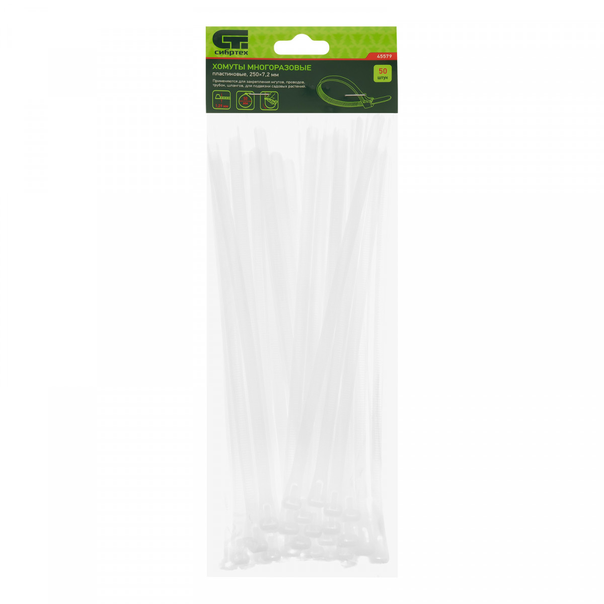 Пластиковые многоразовые хомуты Сибртех 45579 размером 250 х 7,2 мм, 50 шт. в упаковке, — приспособления для стяжки кабелей, шлангов или трубок. Могут применяться для подвязки растений или упаковки предметов. Белые пластиковые стяжки пригодятся во время выполнения электромонтажных работ, ремонта техники, будут полезны в промышленности, торговле, а также в быту.