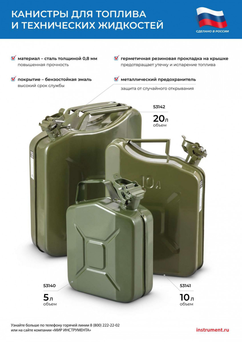 Металлическая канистра 53140 объемом 5 литров, с толщиной стеной 0,8 мм, предназначена для хранения и транспортировки топлива и других горюче-смазочных материалов. Ее удобно брать в дорогу, а также использовать для хранения ГСМ в гараже и на приусадебном участке. Металлическая канистра пригодится для заправки автомобиля в долгом путешествии и для заправки садовой техники.