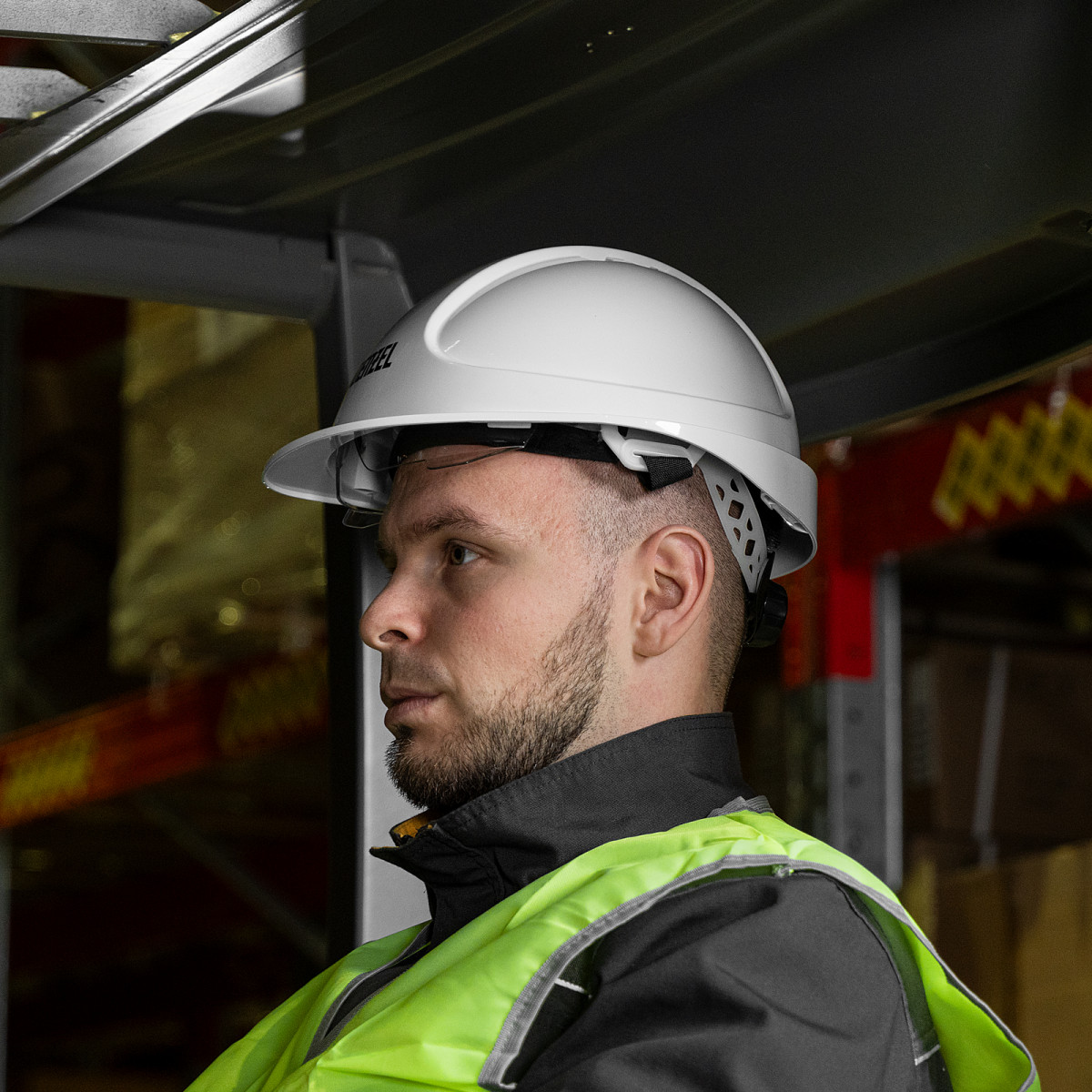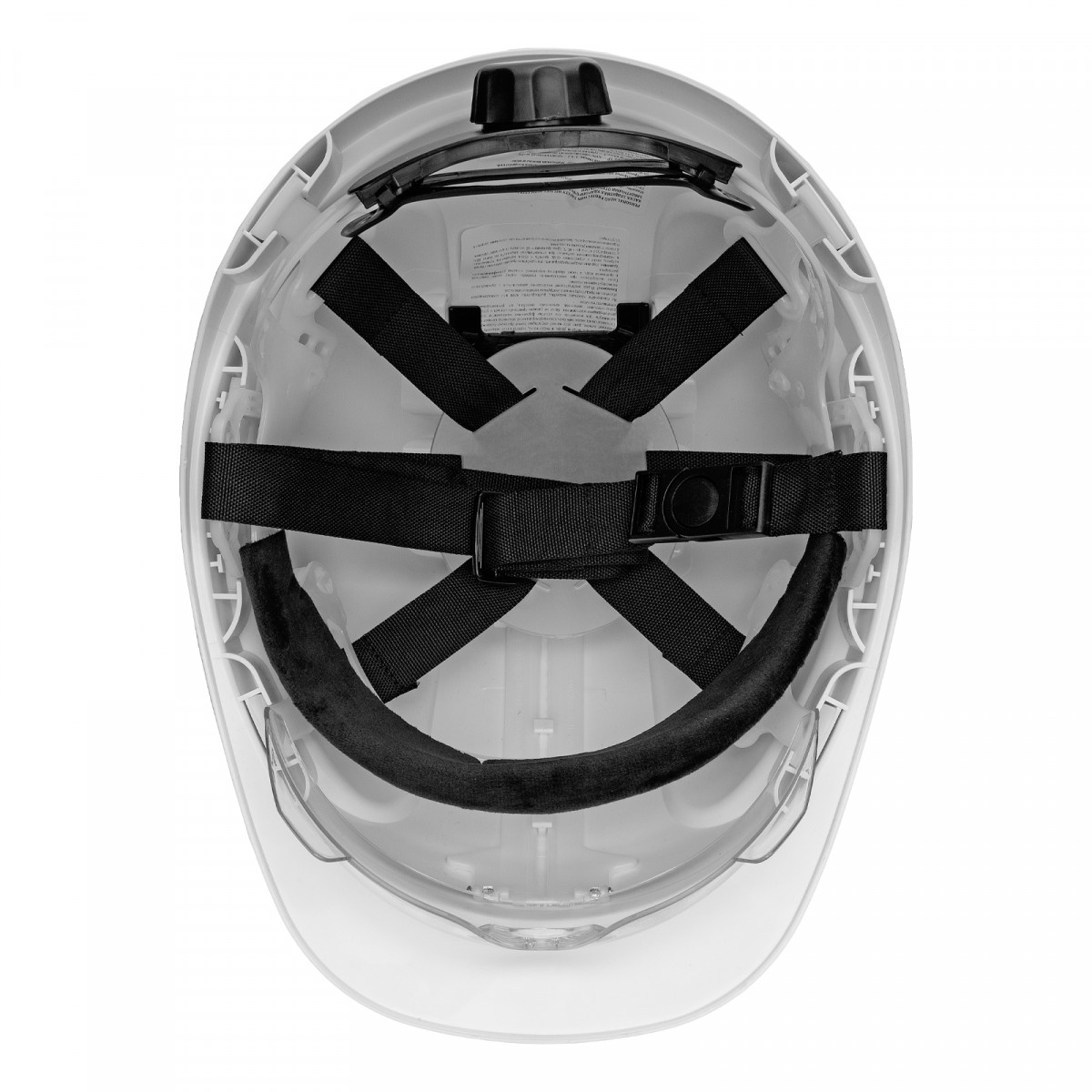 - Удобная посадка — наголовное крепление с храповиком позволяет плавно подгонять и точно регулировать размер оголовья от 52 до 62 см, каска комфортно прилегает к затылочной части головы за счет мягкой эластичной вставки.