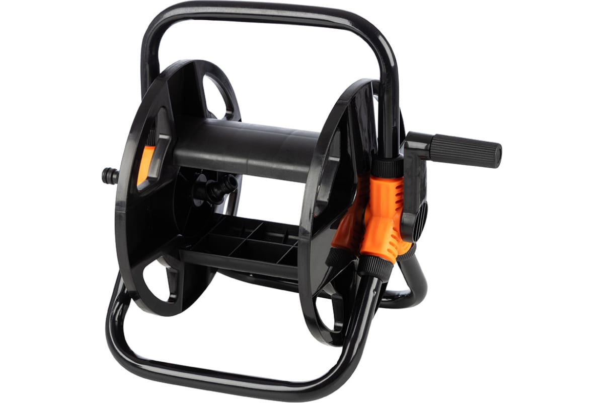 Металлическая конструкция обеспечивает высокую устойчивость катушки для шланга.