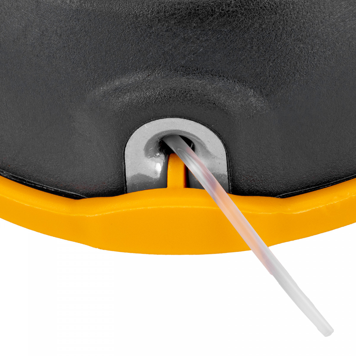 - Высокая скорость работы — для обновления лески не нужно прерывать работу, достаточно слегка ударить катушкой о землю прямо в процессе скашивания травы.