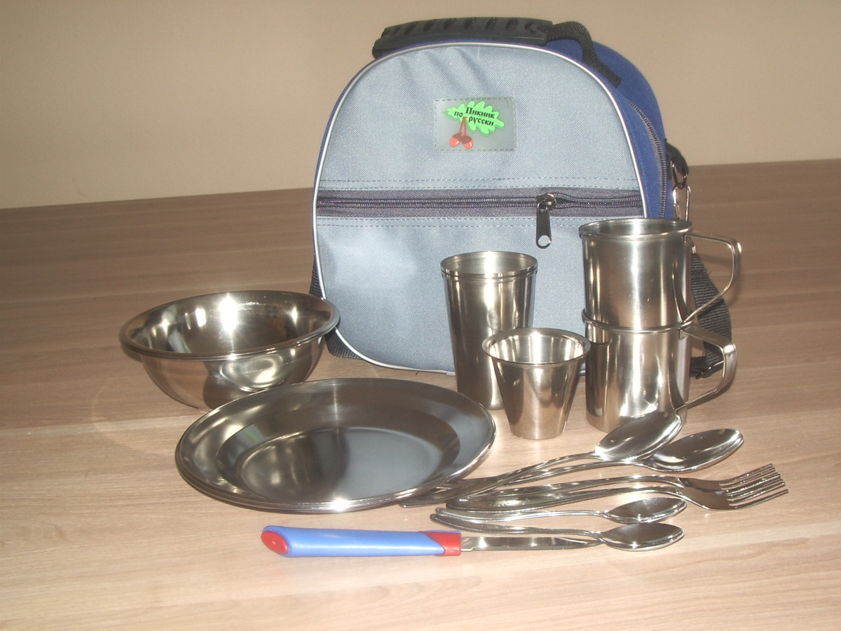 Набор для пикника в кейсе:кружка - 2шт.,стакан - 2 шт.,стопка - 2 шт., миска глубокая - 2 шт.,тарелка - 2 шт.,вилка - 2 шт.,ложка столовая - 2 шт.,ложка чайная - 2 шт.,нож - 1 шт.Посуда из нержавеющей стали, легкая и удобная.Вес комплекта: 3,1 кг.