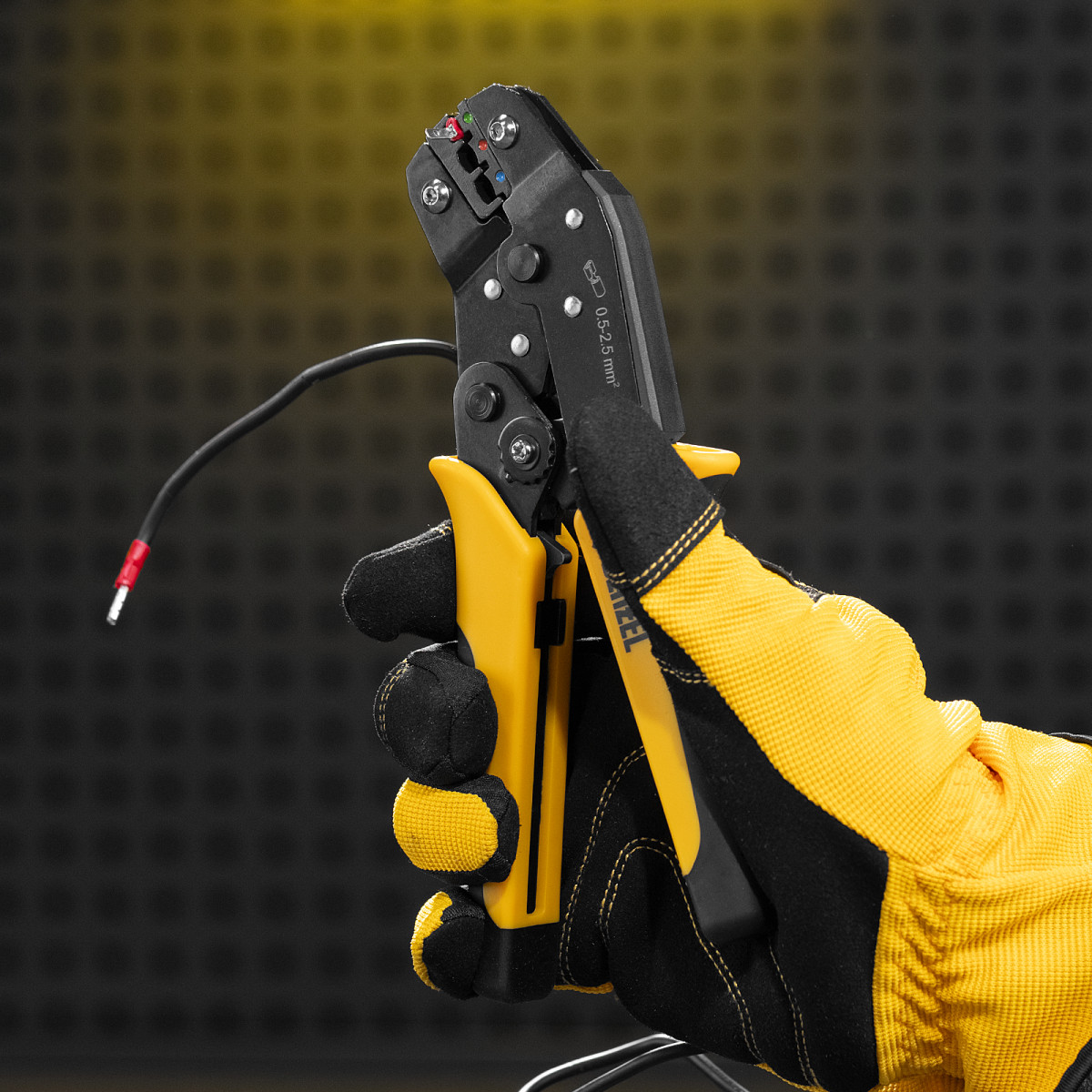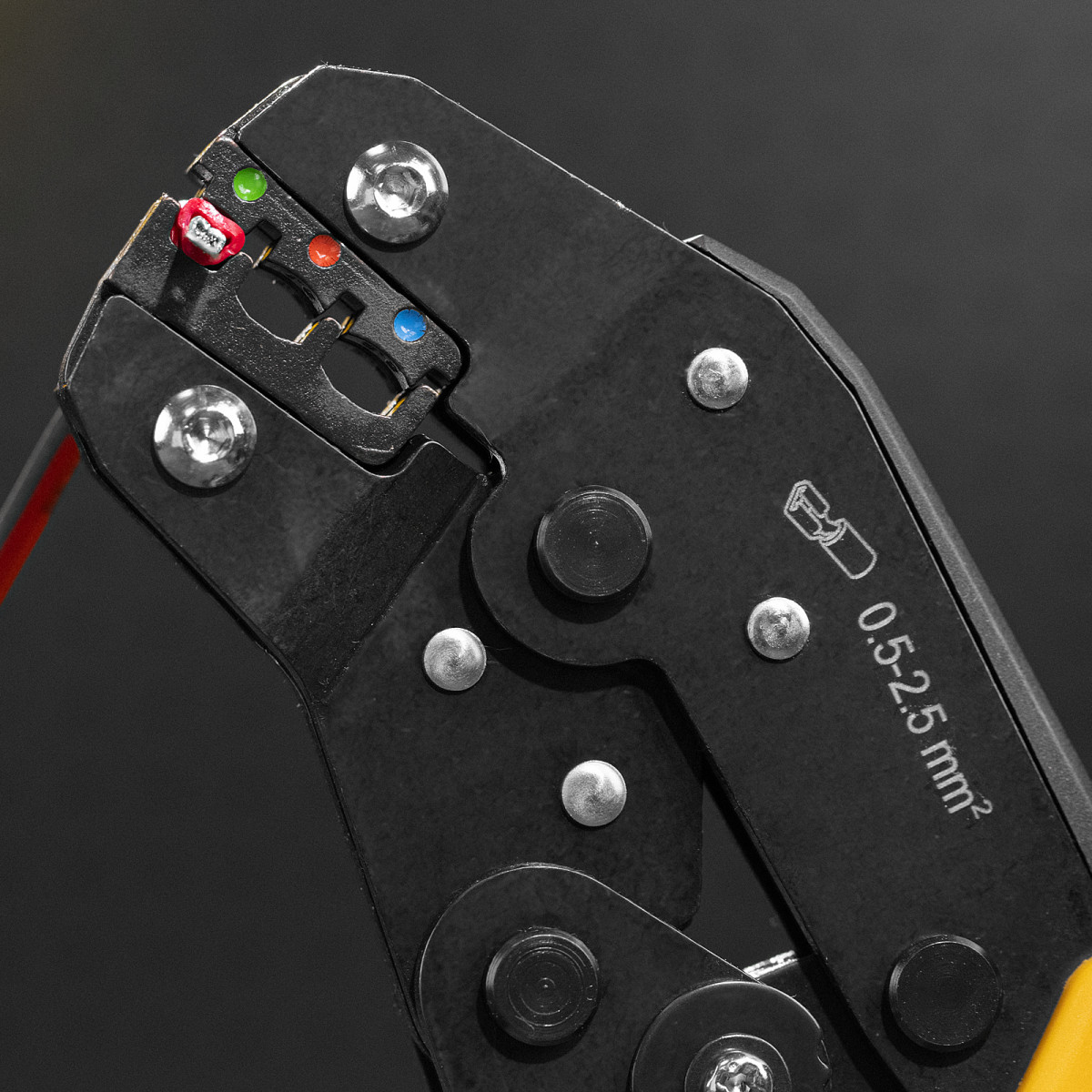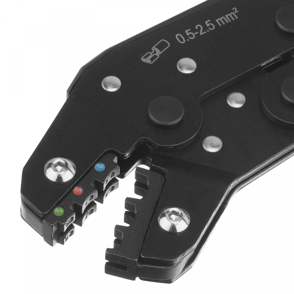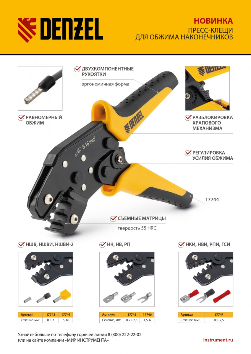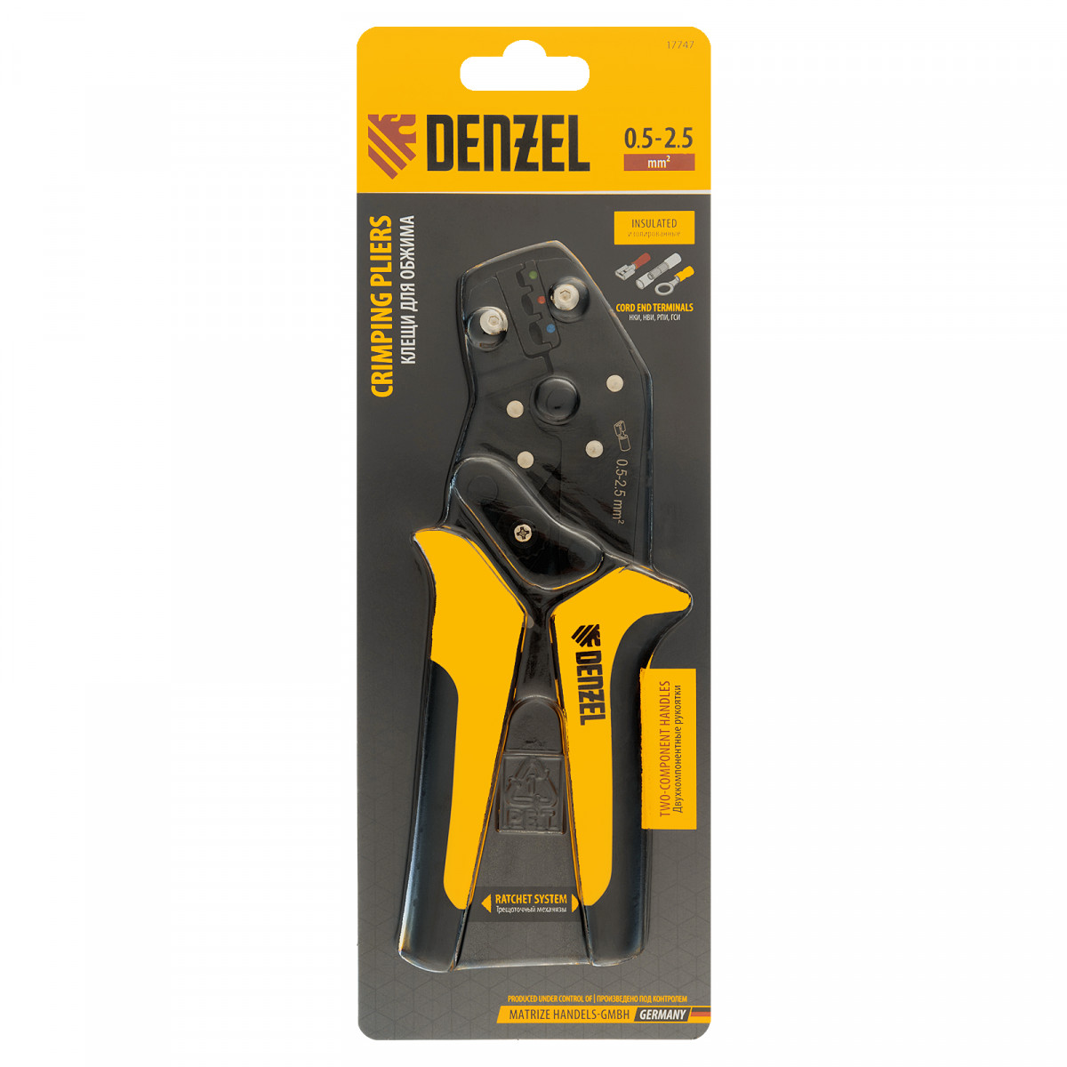 Клещи Denzel 17747 предназначены для обжима изолированных кольцевых наконечников НКИ и вилочных НВИ, разъемов плоских РПИ, гильз соединительных ГСИ сечением 0,5-2,5 мм². Инструмент пригодится частным и профессиональным мастерам при проведении электромонтажных работ.