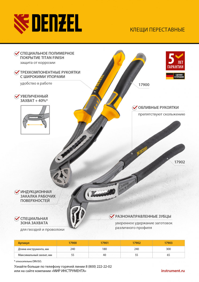 Переставные клещи Denzel 17900 длиной 240 мм, с трехкомпонентными рукоятками, предназначены для фиксации и вращения деталей и заготовок различной формы. Подходят для захвата фитингов, труб, крепежных элементов. Инструмент используется при проведении ремонтных, монтажных, сантехнических работ.