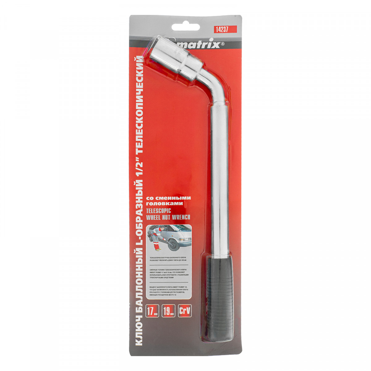 Телескопический Г-образный баллонный ключ Matrix 14237 с присоединительным размером 1/2" поставляется с двойной съемной торцевой головкой 17 х 19 мм и применяется для снятия и установки автомобильных колес. Г-образная форма облегчает работу с крепежом. Ключ будет полезен в гараже, на станции шиномонтажа или в автосервисе, а также поможет быстро заменить колесо в дороге.