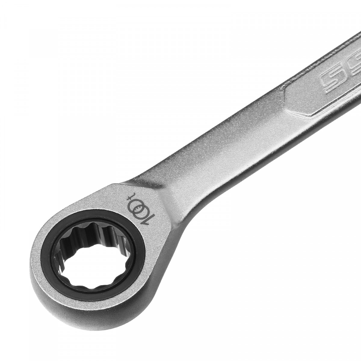 - Храповый механизм оснащен 100 зубцами, что обеспечивает плавность хода инструмента (шаг трещотки всего 3,6 градусов) и делает его удобным для работы в ограниченном пространстве.