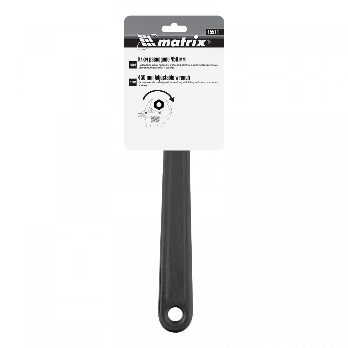 Разводной ключ Matrix 15511 длиной 450 мм используется для монтажа и демонтажа крепежных элементов. Заменяет собой целый комплект обычных гаечных ключей. Губки можно разводить на точно заданное расстояние, что позволяет захватывать детали различного размера. Разводной ключ пригодится для проведения слесарных, сантехнических, ремонтных работ.