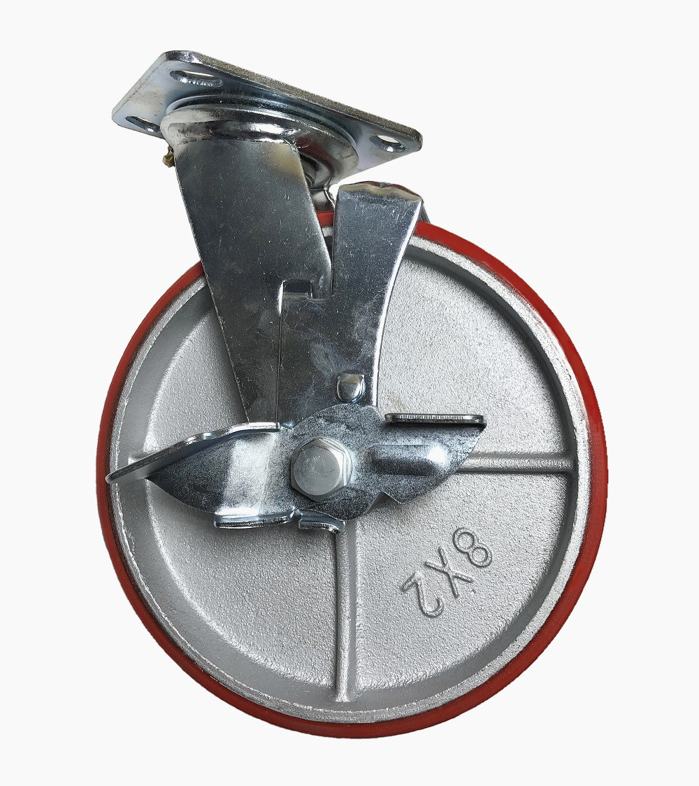 Колесо полиуретановое большегрузное с тормозом SCpb80 для тачек и тележек является грузоподъемным. Чугун служит основой для производства обода полиуретановых колесных опор с тормозом SCpb80.