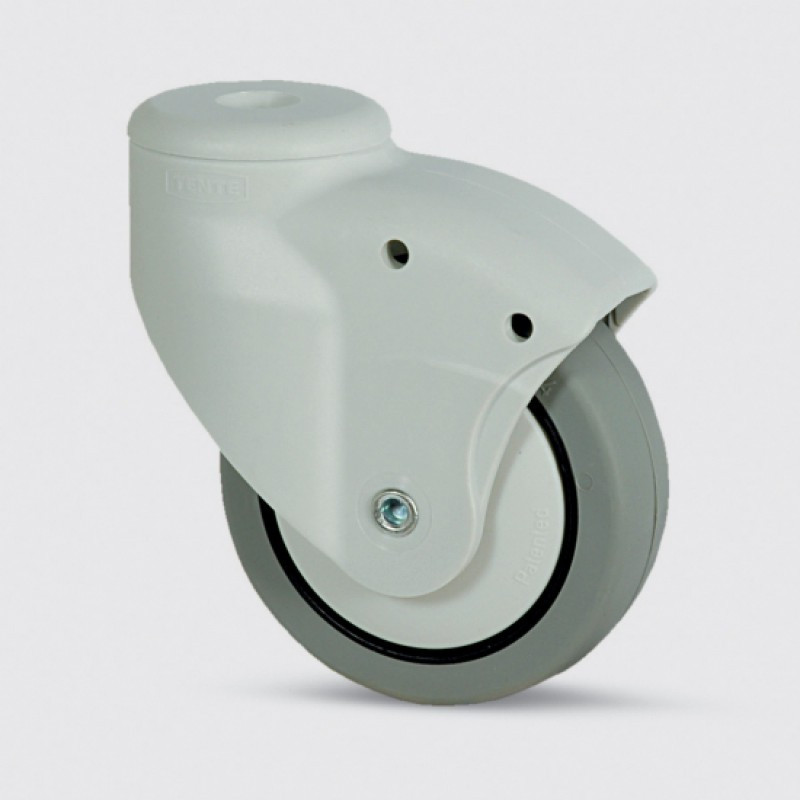 Поворотный ролик, корпус из полиамида. Колесный центр из полипропилена, протектор из термопластичной резины, серый без маркировки, с резьбовой защитой, подшипником скольжения, с отверстием для крепления мебельных роликов.