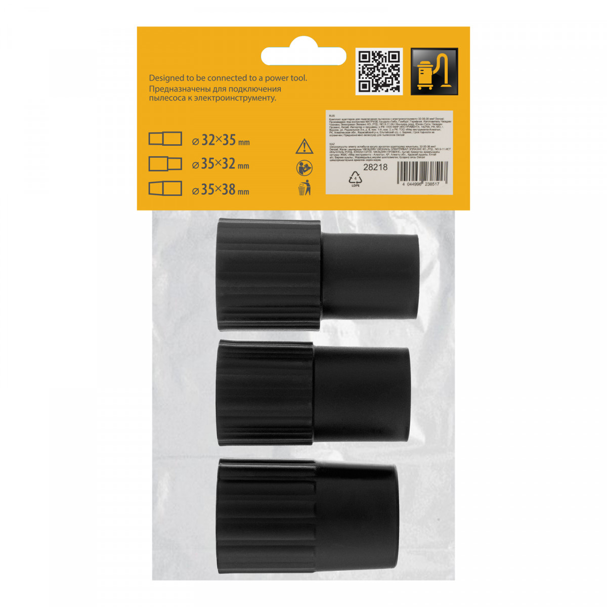 Комплект адаптеров Denzel 28218 включает 3 переходника размером 35 х 32 мм, 32 х 35 мм, 35 х 38 мм и служит для подключения пылесоса к электроинструменту. Такое решение позволяет обеспечить мгновенное удаление пыли, образующейся в процессе сверления, пиления, фрезерования.
