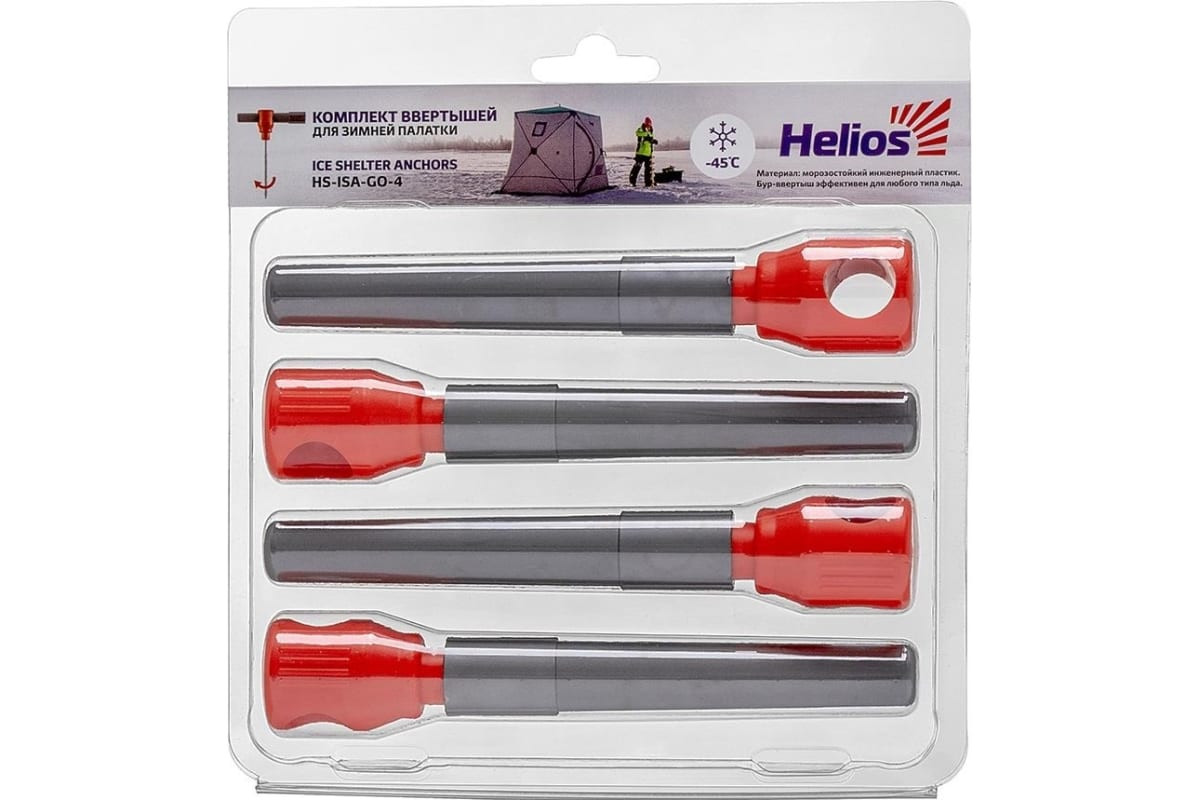 Комплект ввертышей для зимней палатки Helios HS-ISA-GO-4, -45 С, серо-оранжевый, 4шт 266178 предназначены для крепления зимней палатки ко льду.Бур-ввертыш выполнен из высококачественной стали, после закалки имеет высокую твердость - 45 HRC.Материал корпуса выполнен из морозостойкого инженерного пластика, что позволяет эксплуатировать ввертыши в суровых зимних условиях.