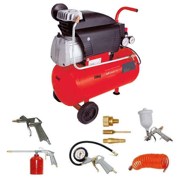 Компрессор FUBAG AIR MASTER KIT + 6 предметов 61431380, благодаря большому комплекту поставки, может применяться для самых различных работ - от накачки шин до окрашивания поверхности. Данная модель оснащена надежным электрическим двигателем, имеющим защиту от перегрева, а также систему автономного повторного пуска. Агрегат работает от однофазной электрической сети, потребляемая мощность - 1500 Вт.