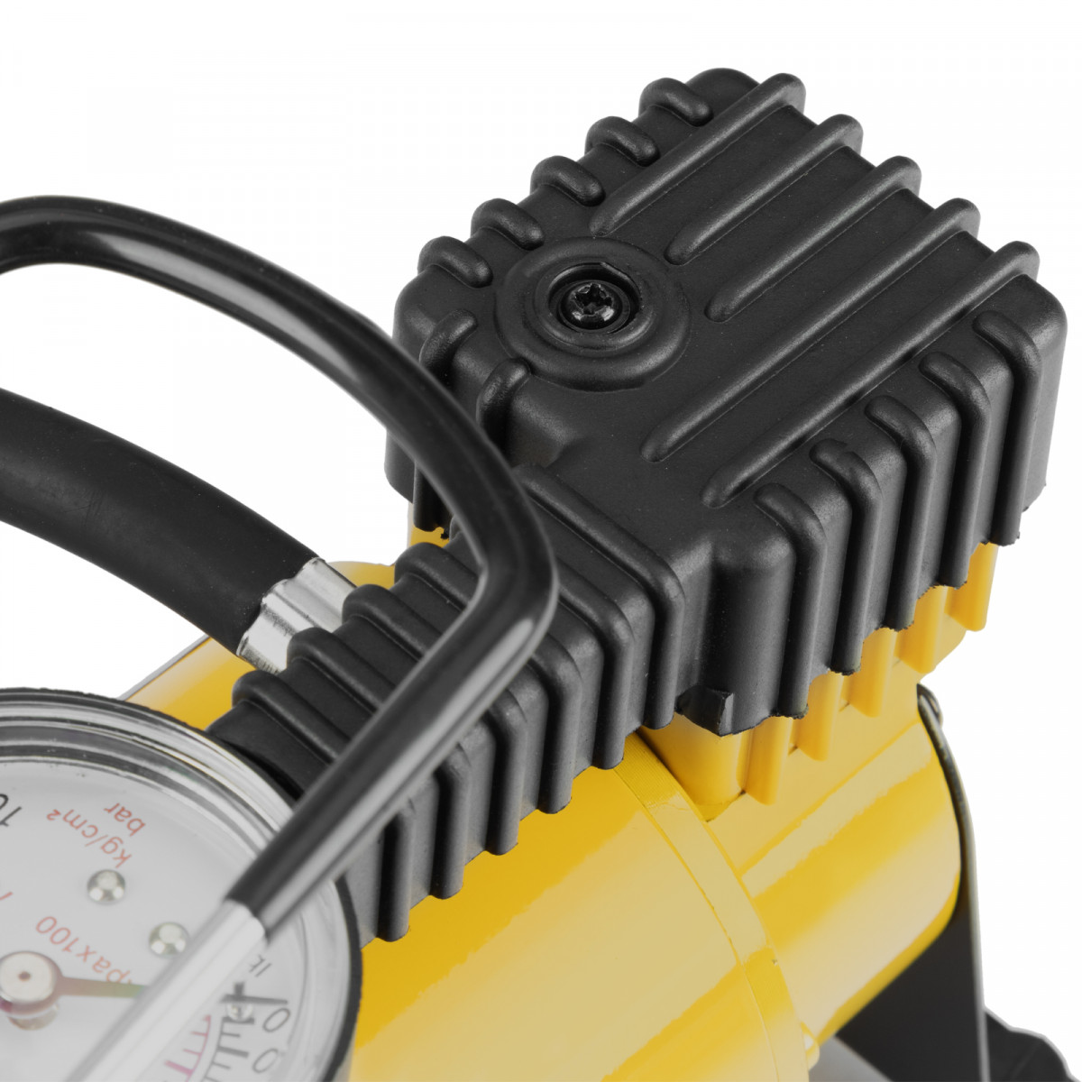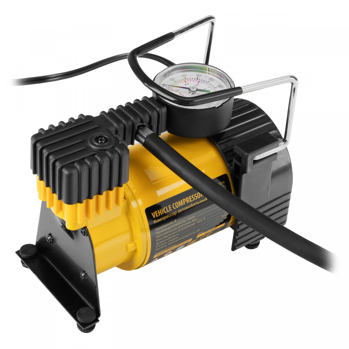 - Компрессор оснащен манометром, что упрощает контроль давления и позволяет вовремя прекратить накачку.