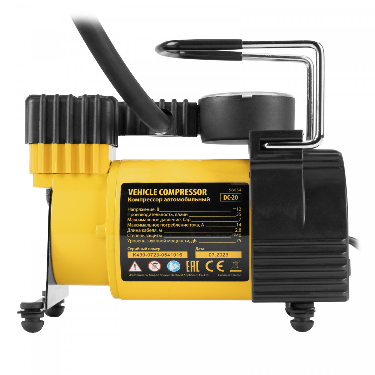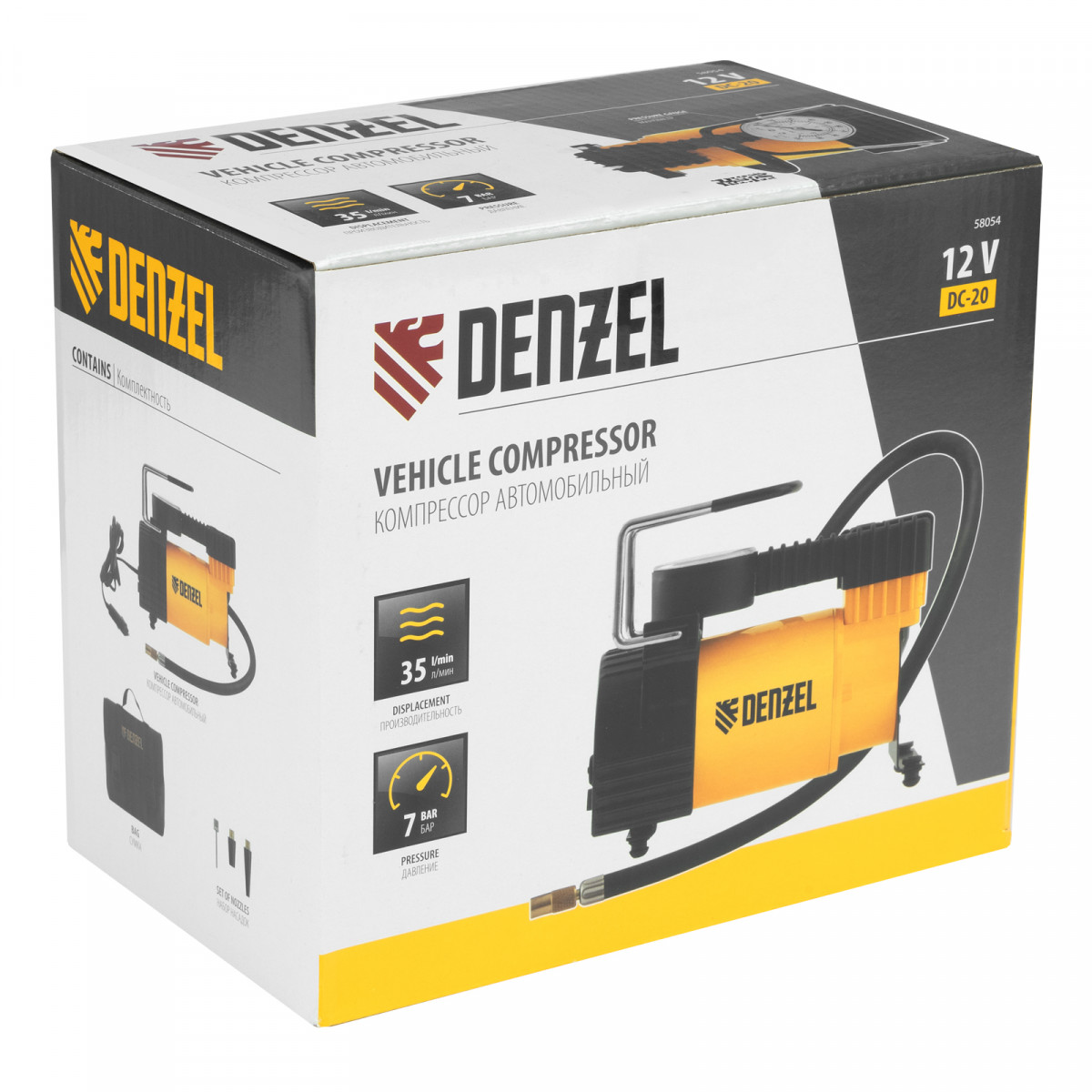 Автомобильный компрессор Denzel DC-20 58054 производительностью 35 л/мин работает от источника питания 12 В, создает давление 7 атмосфер и используется для быстрого накачивания шин автомобильных колес. Благодаря увеличенной мощности на подкачку колеса R16 потребуется не более 4-5 минут. Компрессор также подойдет для накачки мячей, надувных лодок, тюбингов и прочего снаряжения. Устройство не требует технического обслуживания и незаменимо в поездке или во время отдыха на природе.