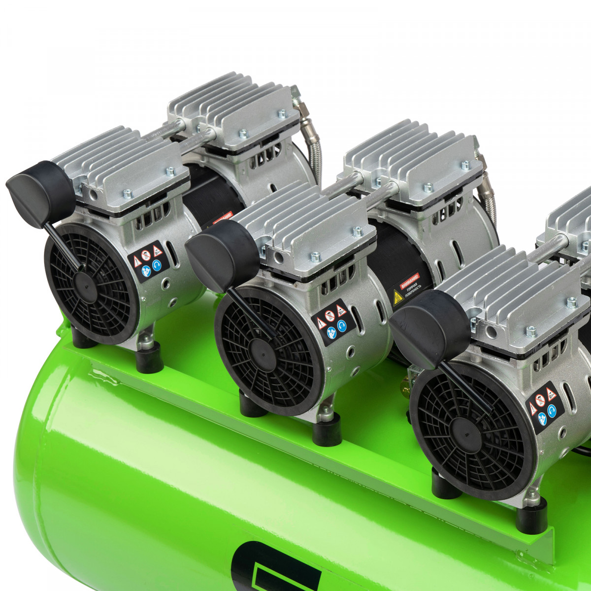 Безмасляный малошумный компрессор Сибртех МБ 2250/100 58008 мощностью 2250 Вт и объемом ресивера 100 л имеет производительность на входе 400 л/мин и сжимает воздух под давлением до 8 бар. Используется для обеспечения функционирования пневмоинструмента, например, краскораспылителя, перфоратора или пневматического шуруповерта. Для работы устройства не требуется масло, поэтому воздух на выходе не содержит его частиц. Компрессор оптимален для проведения покрасочных работ и продувки электронных компонентов.,Одна из ключевых особенностей компрессора — низкий уровень шума (не превышает 70 дБ), позволяющий использовать устройство в жилом помещении без дискомфорта для людей.
