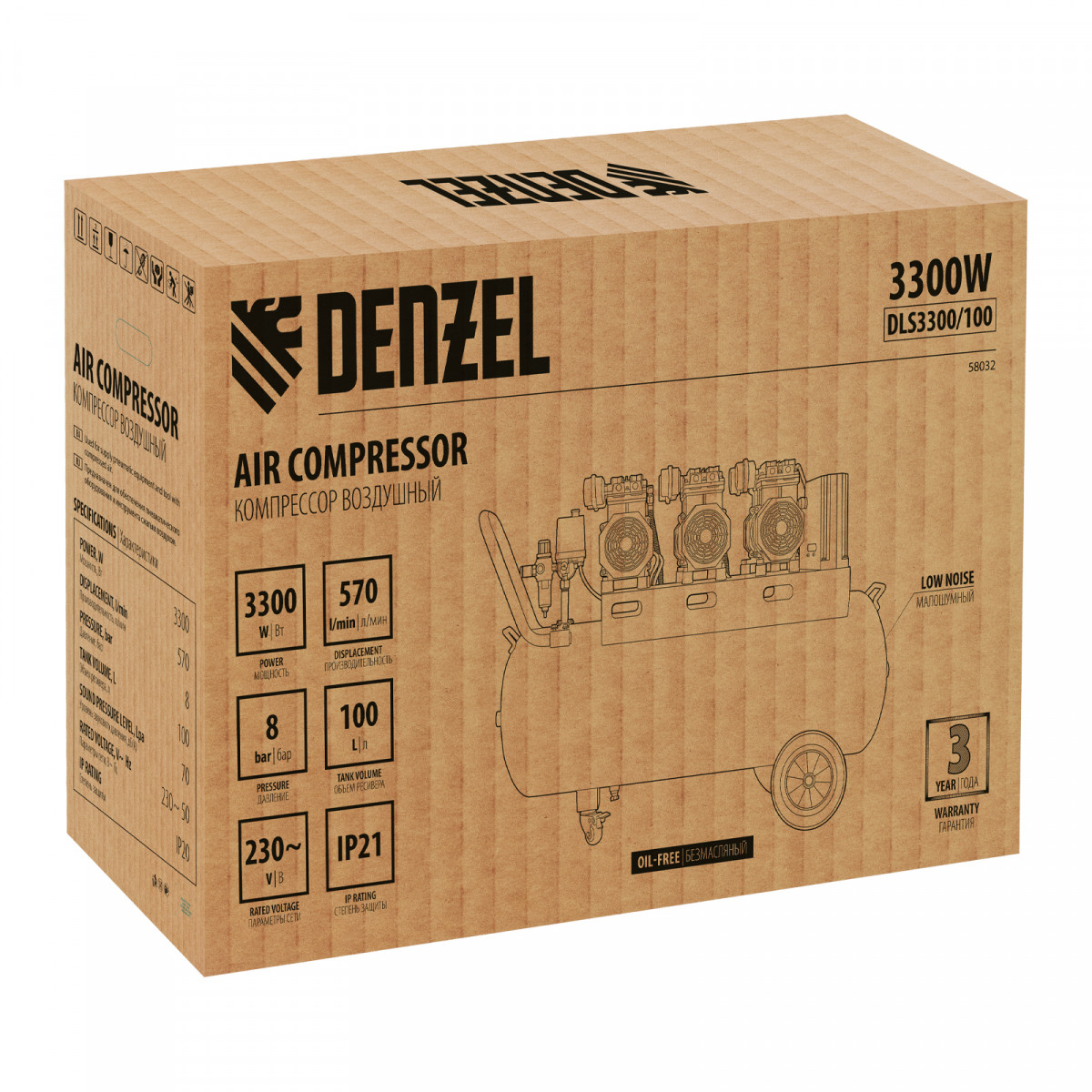 Компрессор безмасляный, малошумный DLS 3300/100, 3300 Вт,3x1100, 100 л, 570 л/мин ,блок управления Denzel