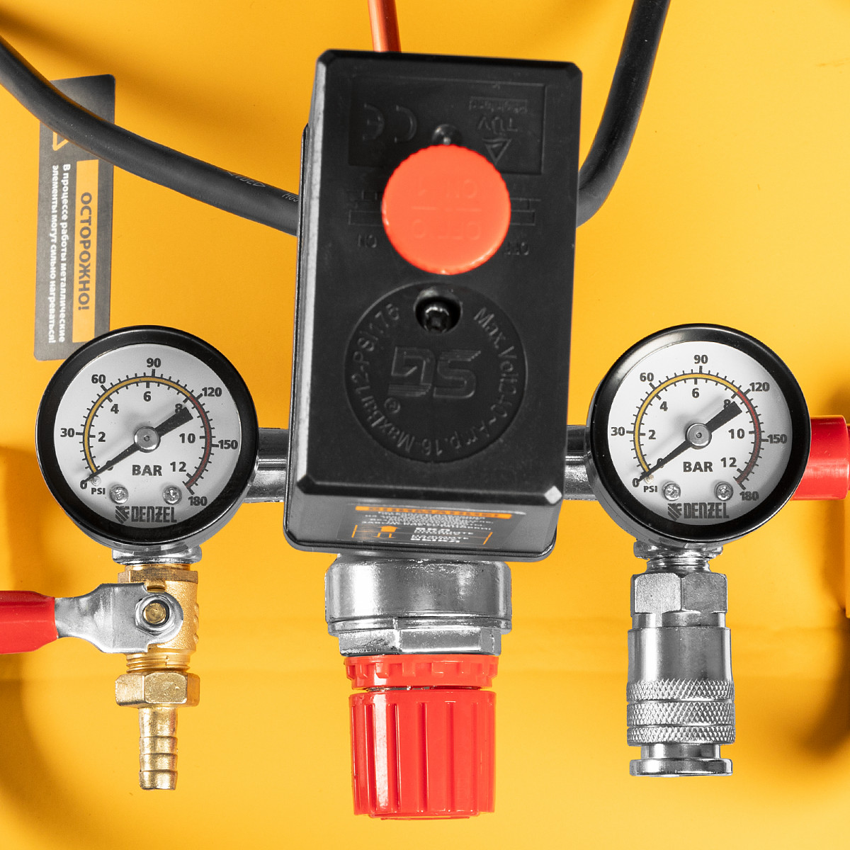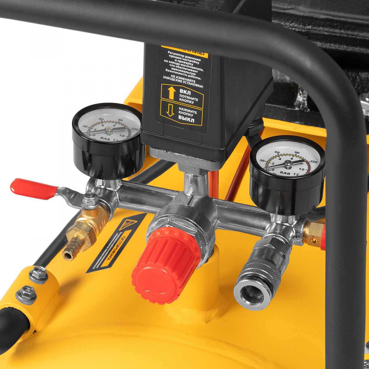 • Удобный контроль работы — 2 манометра позволяют без труда отслеживать уровень давления как в ресивере, так и на выходной магистрали.
