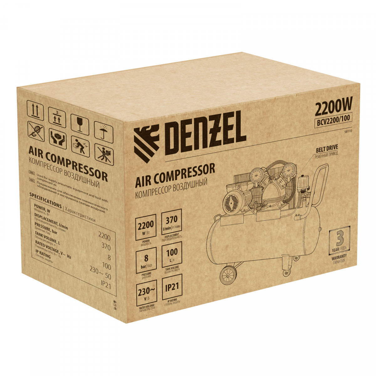 Компрессор Denzel BCV2200/100 58110 мощностью 2,2 кВт и производительностью 370 л/мин, с ресивером на 100 литров, предназначен для работ в мастерских, автосервисах, на производствах или в быту. К нему можно подключать сразу 2 пневмоинструмента, например, дрель, долото, заклепочный или продувочный пистолет, краскопульт, очиститель окалины и пр.,Высокий ресурс чугунных цилиндров, надежная ременная передача и объемный ресивер на 100 л позволяют использовать компрессор длительное время. При необходимости можно напрямую подключать второй накопитель или пневмомагистраль через дополнительный порт.