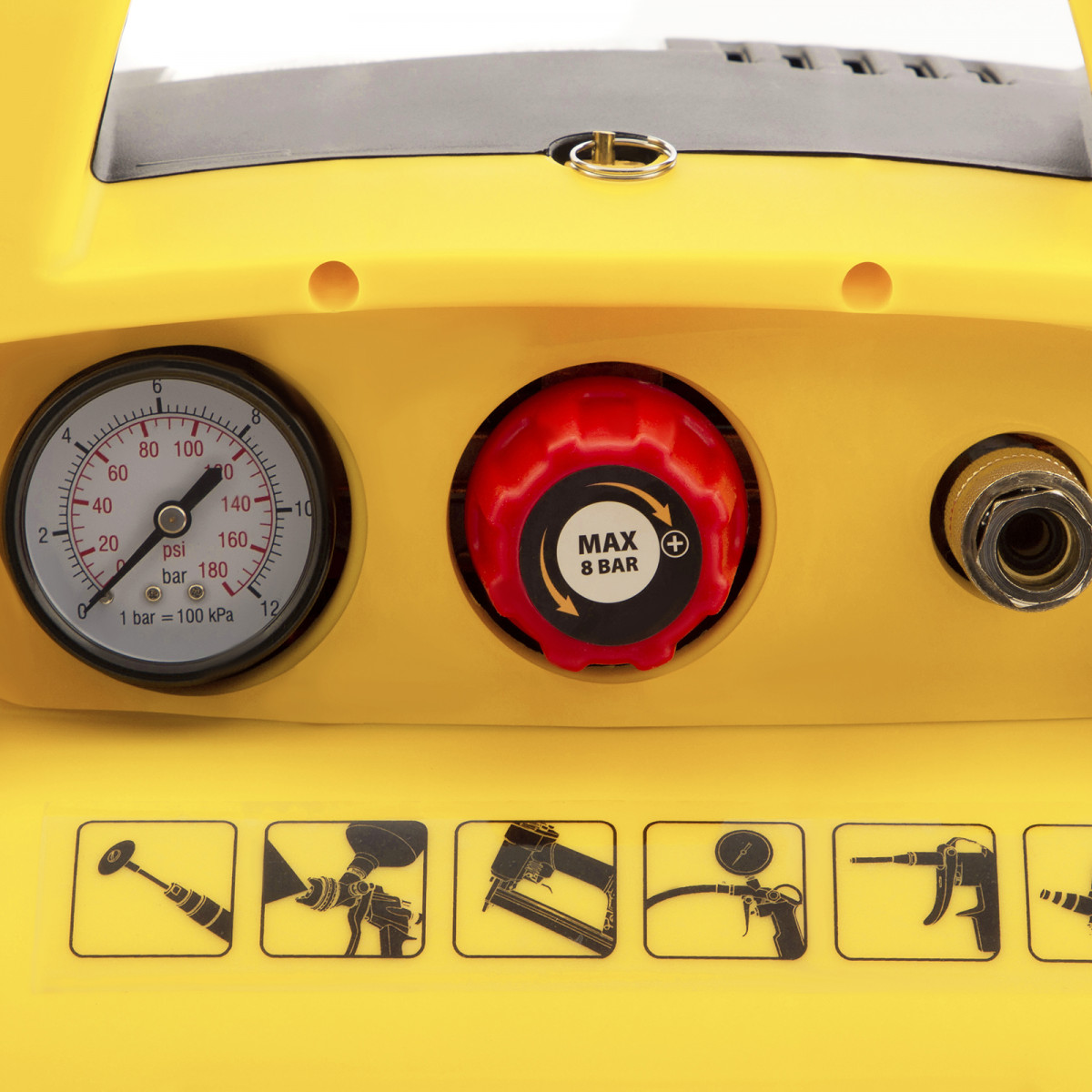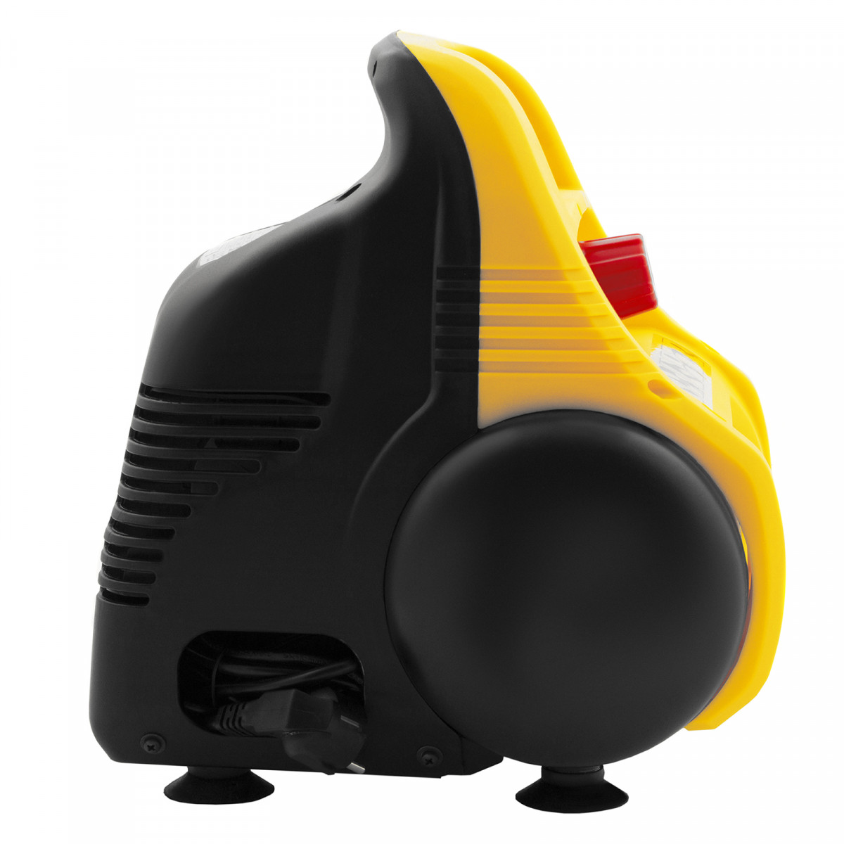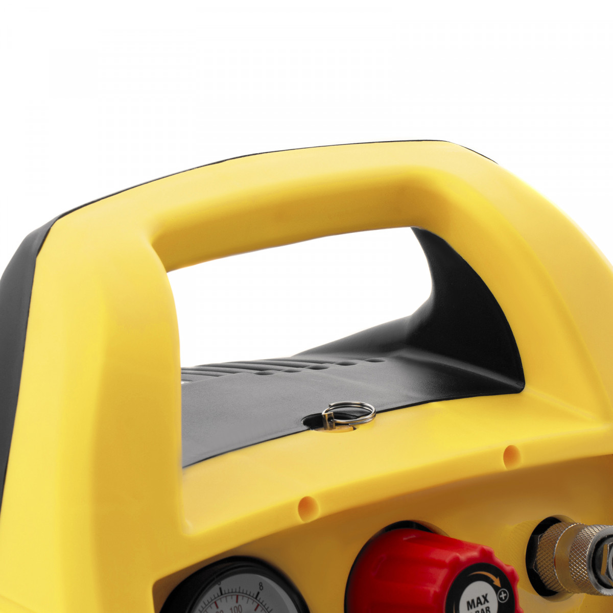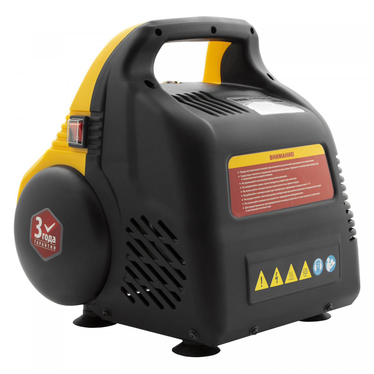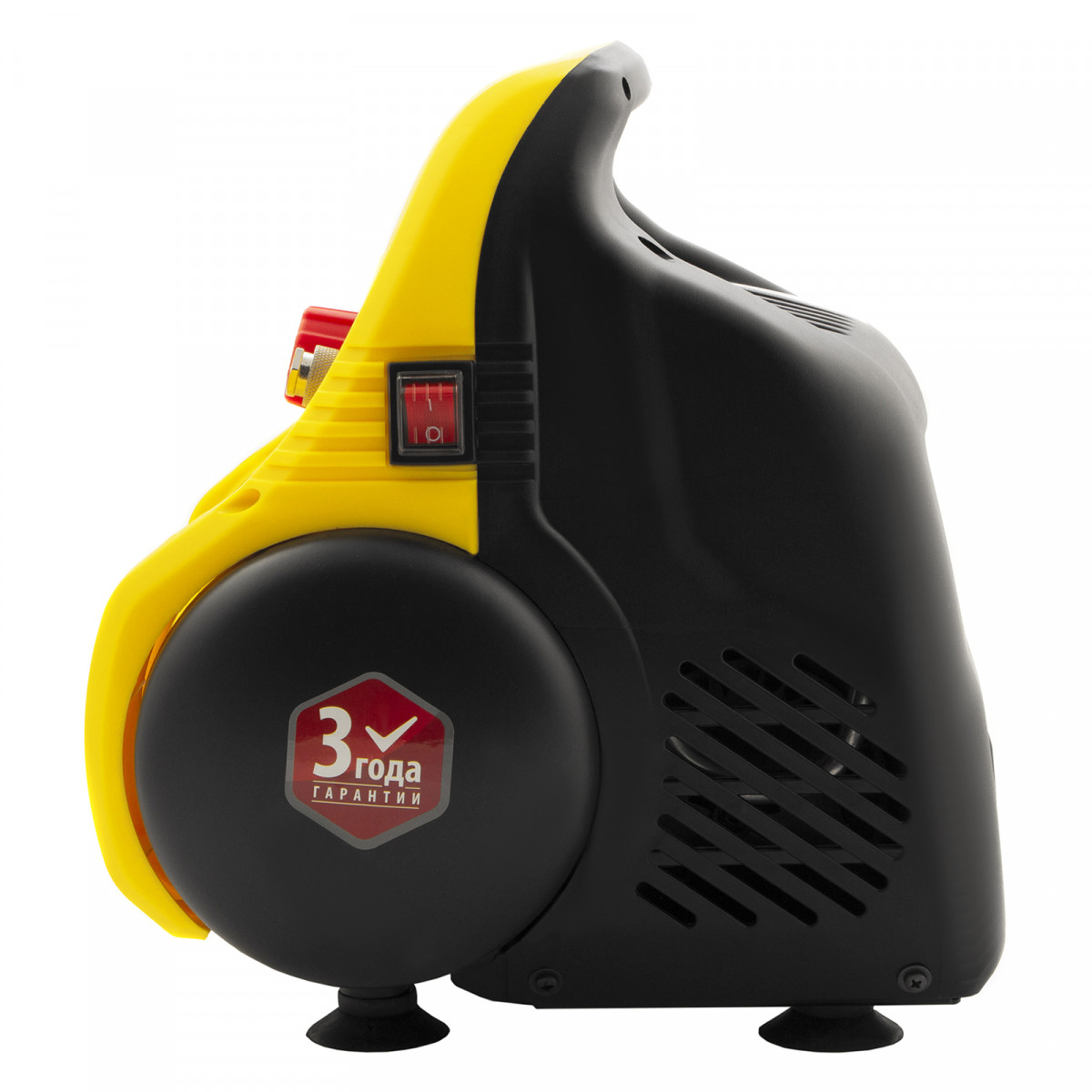 Безмасляный компрессор подходит для работ, не допускающих попадания масла в воздух: покраски, накачки шин, продувки компьютерной техники, чистки строительных инструментов. Допускается подключение пневмонейлера и пневмогравера. Безмасляная технология RTFE значительно упрощает работу с устройством: не нужно использовать маслоуловители или маслоотделители, искать масло и следить за его уровнем.,Генератор энергии сжатого воздуха вырабатывает 180 л в минуту с мощностью 1.1 кВт, что является пиковым значением для безмасляных моделей такого класса. ,Компактные размеры и продуманный дизайн позволяют легко переносить компрессор за удобную транспортировочную ручку. Вес 11.15 кг и габариты 30 х 33 х 36 см упрощают размещение устройства на рабочей площадке и хранение.