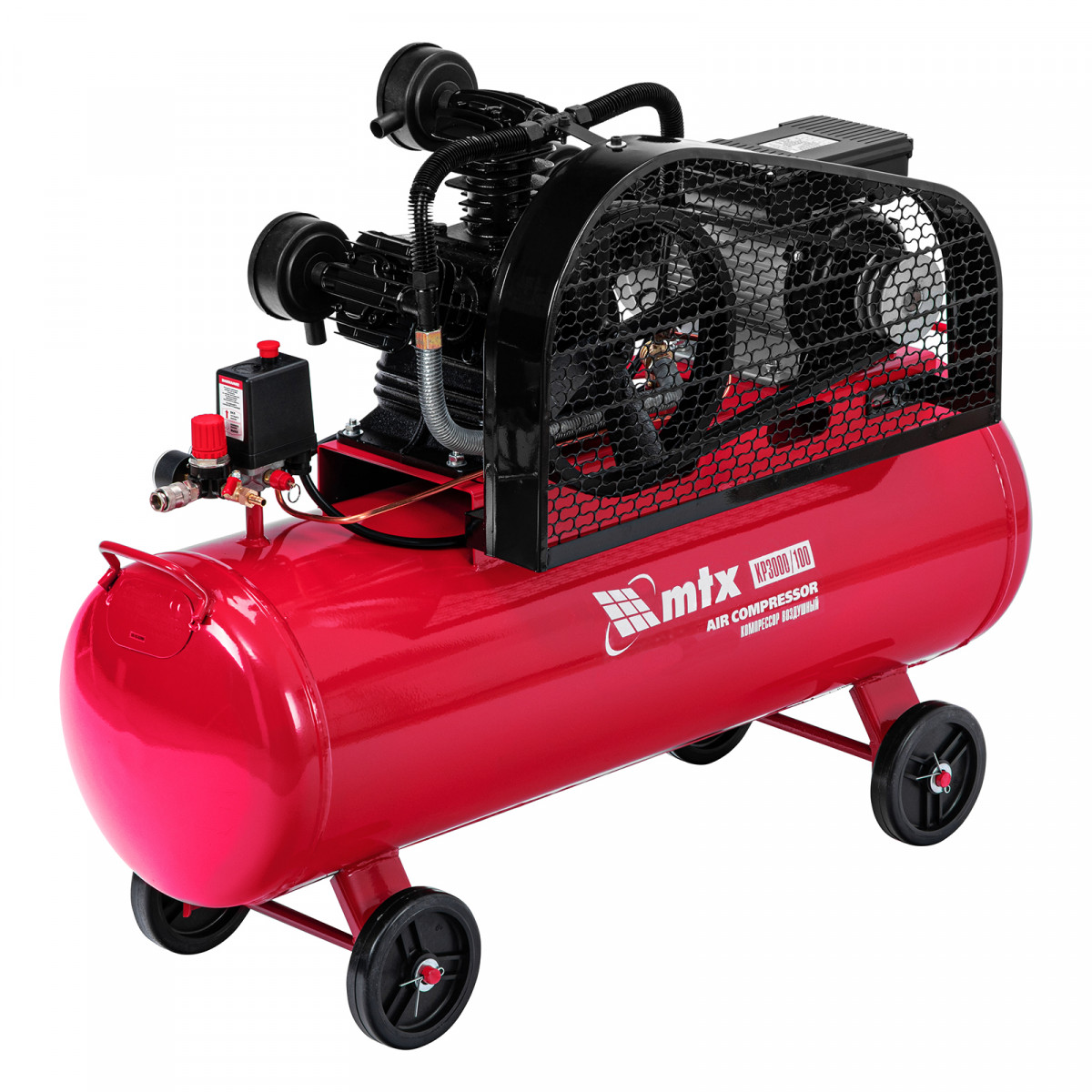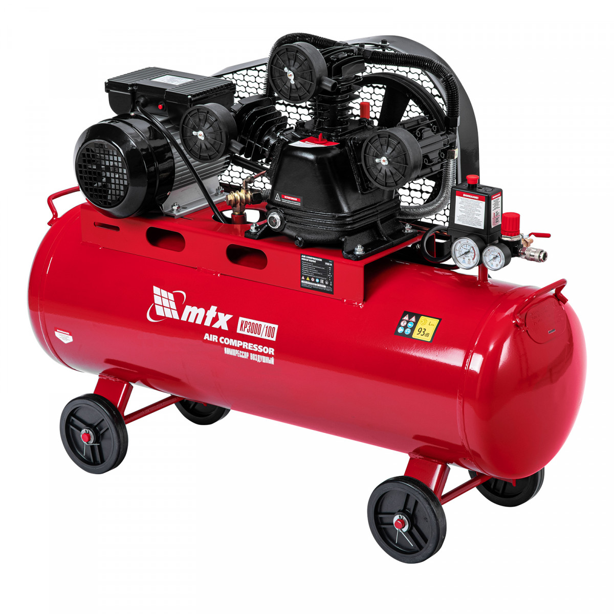 Компрессор воздушный МТХ КР3000/100 58023 с ременным приводом от электродвигателя, мощностью 3,0 кВт и производительностью 510 л/мин, с ресивером объемом 100 литров, применяется для подачи сжатого атмосферного воздуха к пневматическому инструменту. К нему можно подключить гайковерт, дрель, углошлифовальную машину, степлер, краскопульт, продувочный пистолет или другой пневмоинструмент. Для подключения предусмотрены 2 штуцера: быстросъемный и «елочка». Компрессор подходит для профессионального использования на предприятии автосервиса, строительной площадке, в мастерской.