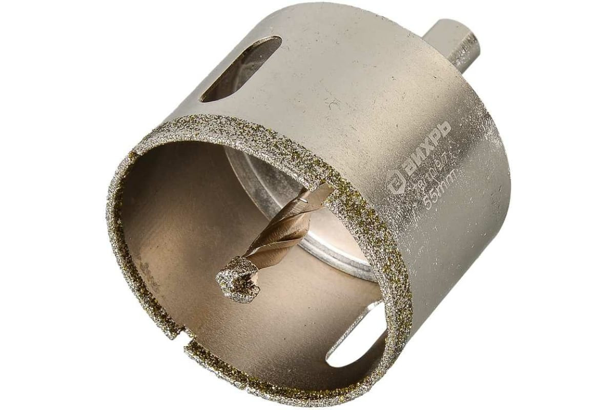 Коронка алмазная по керамограниту/керамике 55 мм Вихрь 73/10/9/7 предназначена для сверления отверстий в керамограните или природном камне.На начальном этапе сверления направляющее сверло входит в обрабатываемый материал и является осью будущего отверстия. Как только кольцевое алмазное сверло углубится в материал примерно на 1 мм, направляющее сверло можно снять и продолжить сверление без него.Для повышения стойкости и производительности рекомендуется использовать водяное охлаждение.При сверлении особо твердых видов керамогранита рекомендуется просверлить центральное отверстие алмазным сверлом малого диаметра (равного размеру направляющего сверла) и в дальнейшем использовать данное отверстие в качестве оси для сверления.