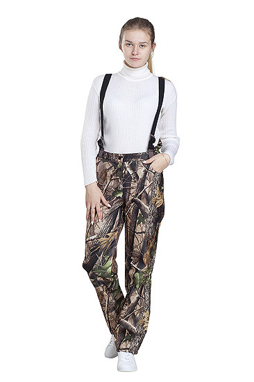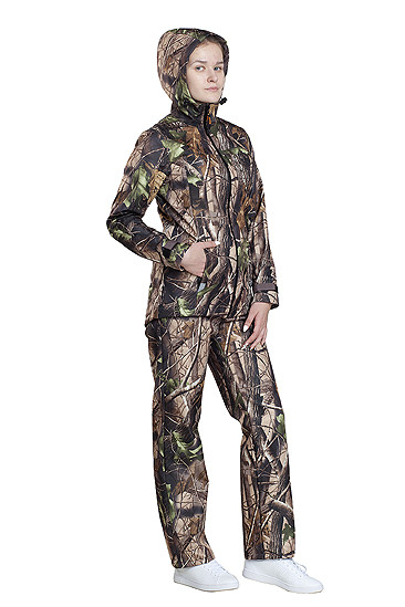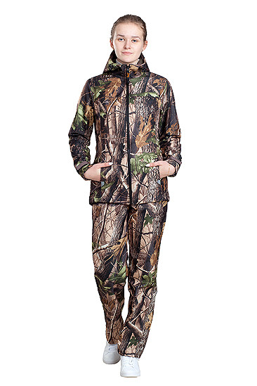 Практичный женский костюм в комуфляжной расцветке для активного отдыха на природе. Из современной трехслойной ткани ПОНЖИ. Ткань прочная и дышащая, с водоотталкивающим покрытием, быстро сохнет и обеспечивает воздухообмен. В этой куртке вы будете чувствовать себя защищенной от влаги и ветра, в любую погоду холодного демисезонья.