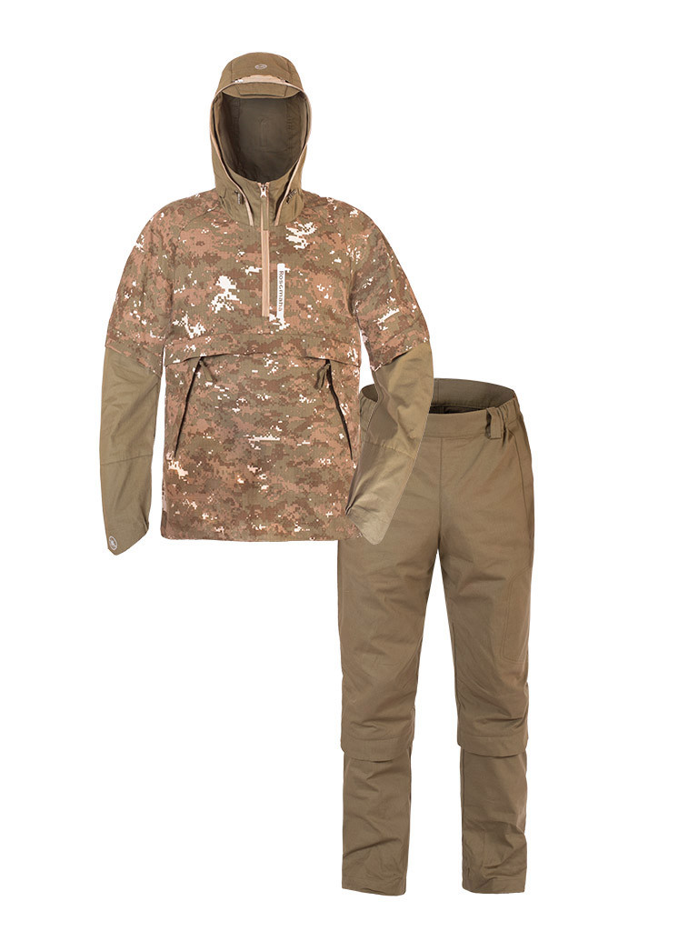 Костюм для любителей охоты, рыбалки и просто активного отдыха в лесу, который защитит от укусов клещей и других кровососущих насекомых. Высокую степень защиты обеспечивают ловушки, расположенные на полочке, спинке, верхней части рукава, нижней части брюк, в нижней части капюшона, которые преграждают движение насекомого вверх. А также акарицидная пропитка, которой обработана ткань костюма. Противомоскитная сетка защитит лицо от мошки и гнуса. Костюм сшит из прочной армированной ткани рип-стоп. Ткать не шуршит, прочная, устойчива к механическим повреждениям и истираниям.