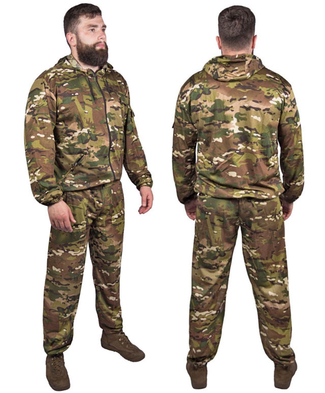 Костюм маскировочный летний выполнен из смесовой ткани-сетки, в составе которой 65% хлопка /20% вискозы и 15ПЭ.
