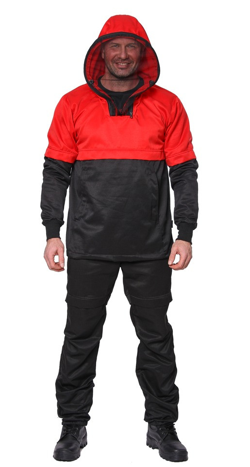 Куртка: - анорак (без распашной застежки), спереди один большой накладной карман с двумя входами по бокам, входы выполнены с помощью листочек и застегиваются на липу. Капюшон не отстегивается, имеет регулировку в средней части хлястиком на липе по высоте и утягивается шнуром по лицевому краю. Есть защитная сетка на лицо, можно отстегнуть и убрать в потайной карман. Низ рукавов с трикотажными манжетами по запястью. Имеются ловушки на рукавах и в области груди. Гиз куртки утягивается шляпной резинкой с двух сторон. Брюки: - без застежки, пояс широкий с резинкой, есть шлевки для ремня, 2 глубоких кармана в отрезных бочках, имеются ловушки в области колена, низ брючин стянут резинкой• глубокие карманы