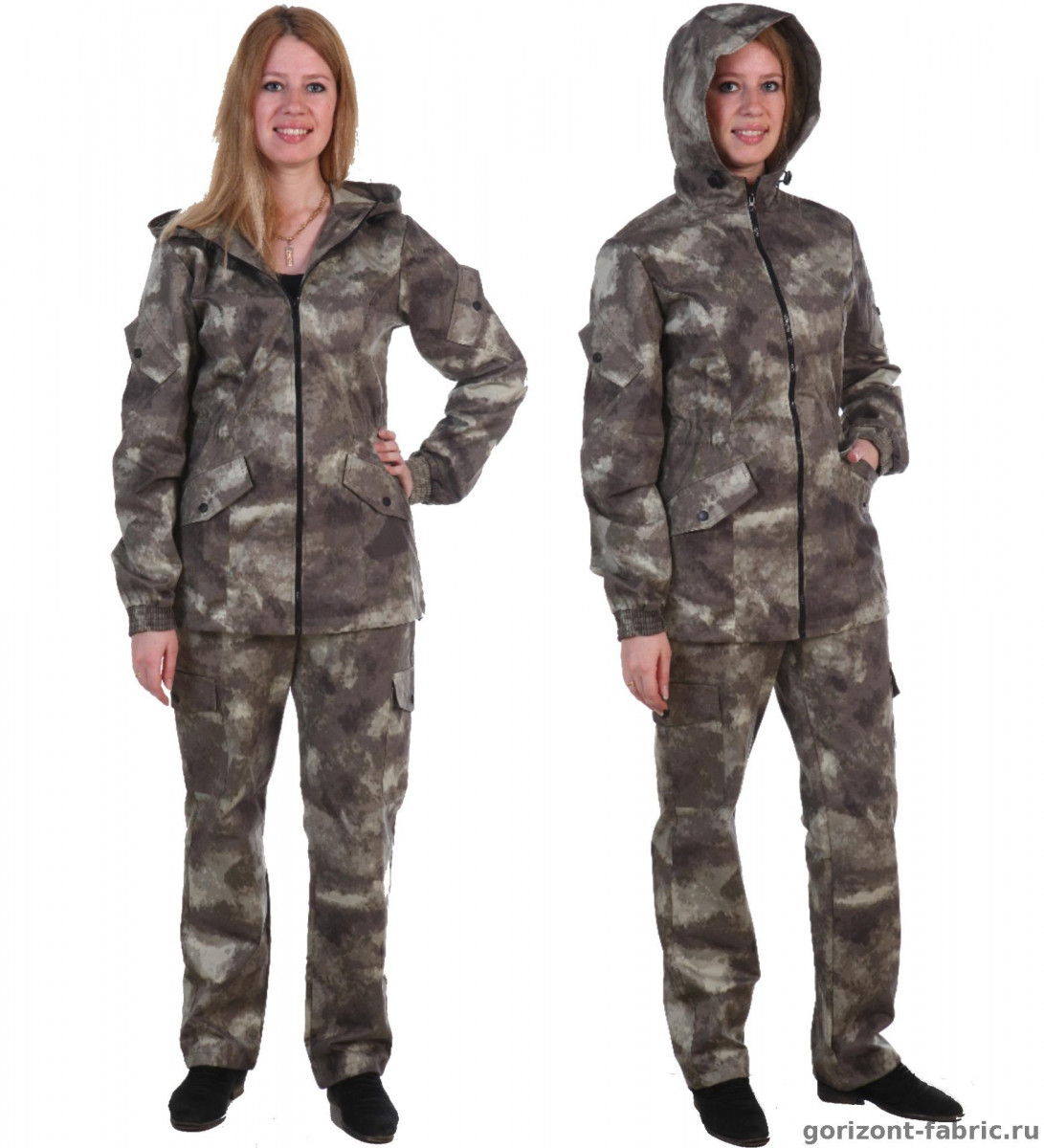 Костюм летний женский "Амазонка" выполнен из ткани - 100% хлопка. Куртка на молнии, приталенного кроя с эластичными вставками по бокам для более плотного прилегания к талии. На куртке имеется четыре кармана: два накладных на рукавах и два нижних с клапанами с застежками на кнопку. Капюшон, низ куртки и низ брюк регулируется резинкой с фиксаторами. Манжеты на рукавах и пояс брюк на резинке. На брюках имеются четыре кармана: два прорезных на бедрах и два накладных кармана чуть выше колена с клапаном и с застежкой на кнопку.