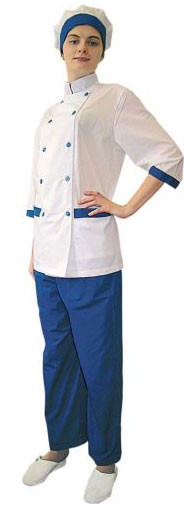 Костюм состоит из куртки, брюк и колпака. Куртка двубортная на пуклях с двумя накладными карманами, воротник - стойка, рукав 3/4. Карманы, рукава, колпак декорируются контрастной тканью в цвет брюк. Брюки прямого кроя на резинке. Ткань смесовая 35% хлопок, 65% полиэстер, плотность 120 г/м2