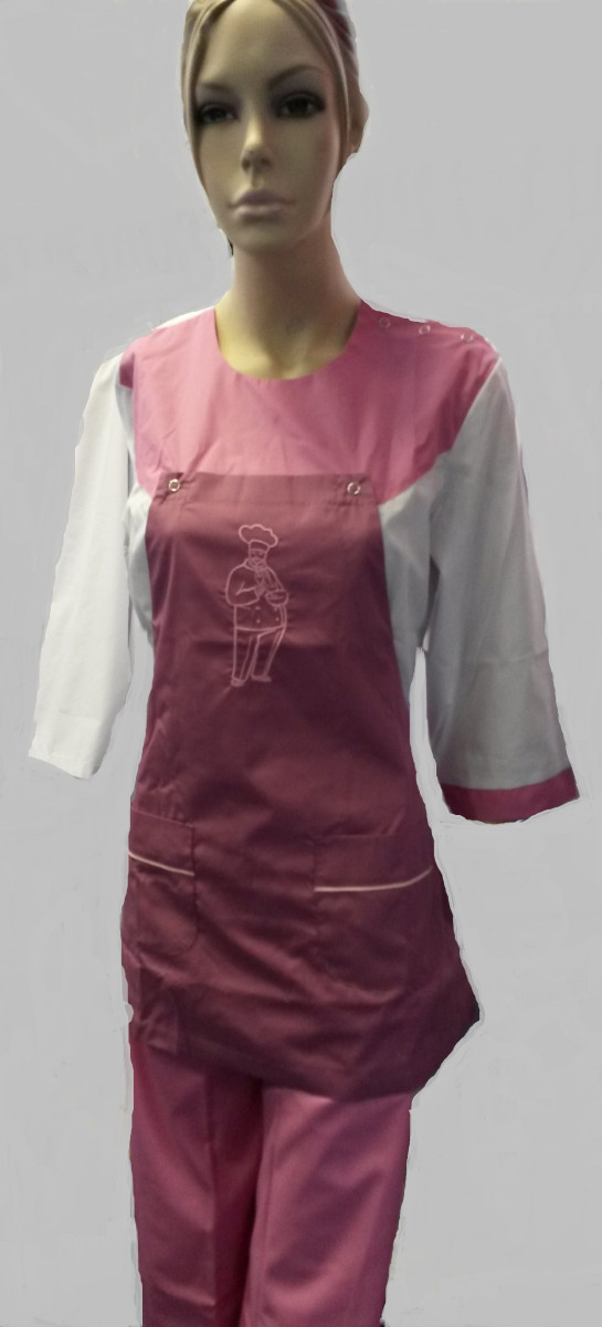 Необычный вариант для поваров - костюм тройка (блузон, фартук, брюки) Блузон приталенного силуэта, с круглым вырезом горловины и застежкой на кнопки на плечевом шве. Кокетка о манжеты на рукавах выполнены из ткани в тон брюк. Фартук контрастного цвета с застежкой на груди кнопками к блузону. Два накладных удобных кармана. Вышивка на груди в виде маленького повара. Брюки прямого силуэта, зауженные книзу, Удобный широкий пояс-резинка. Сидят точно по фигуре.