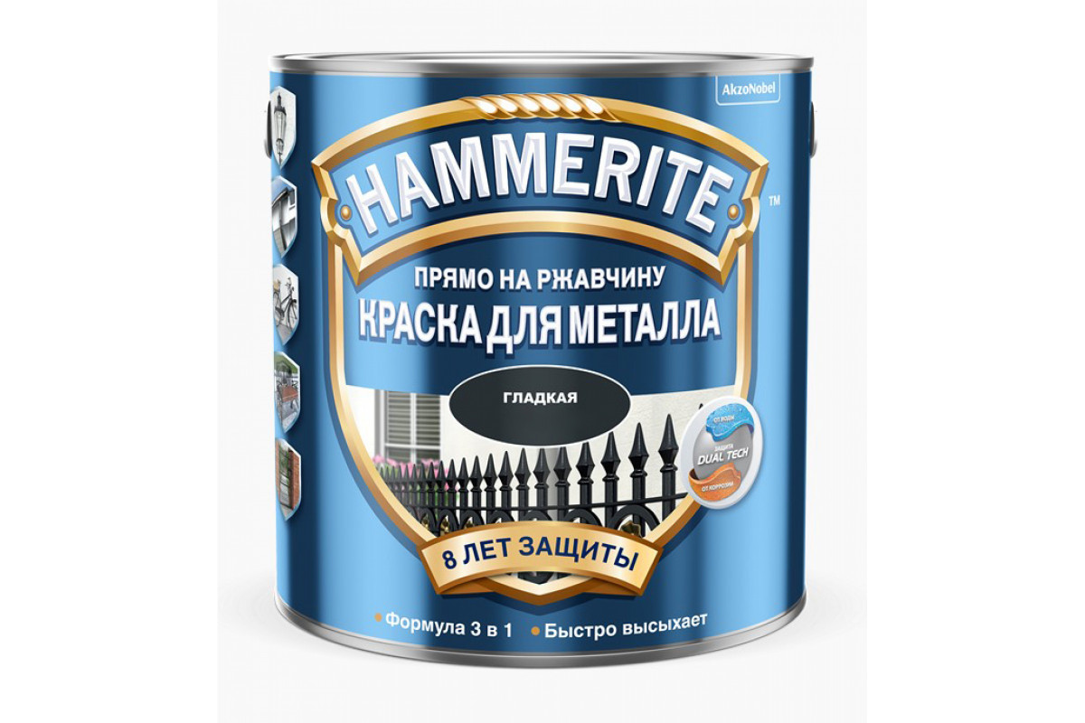 Эмаль гладкая по ржавчине Хаммерайт, уже с новой технологией DualTech, гарантирует срок службы покрытия 8 лет. Гладкая эмаль по металлу и ржавчине образует глянцевую гладкую поверхность. Ложится равномерным ровным слоем, не образует на поверхности подтеки и не растекается. Защищает поверхность от образования новой коррозии. Имеет богатую палитру цвет, быстро сохнет на поверхности.