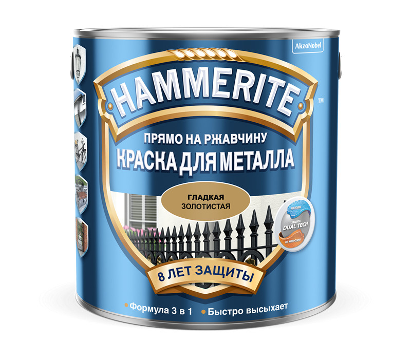 Краска Hammerite гладкая золотистая 0,75л по металлу прямо на ржавчину 3в1