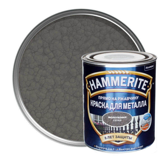 Молотковую краску Hammerite можно наносить непосредственно на ржавую поверхность, так как она обладает превосходной укрывистостью даже без предварительного грунтования. Краской очень легко работать, она быстро сохнет и защищает металл от коррозии на протяжении восьми лет. Благодаря алюминиевым хлопьям в составе после окрашивания на поверхности появляется характерный рисунок молотковой чеканки.Преимущества:повышенные водоотталкивающие и термостойкие качества;