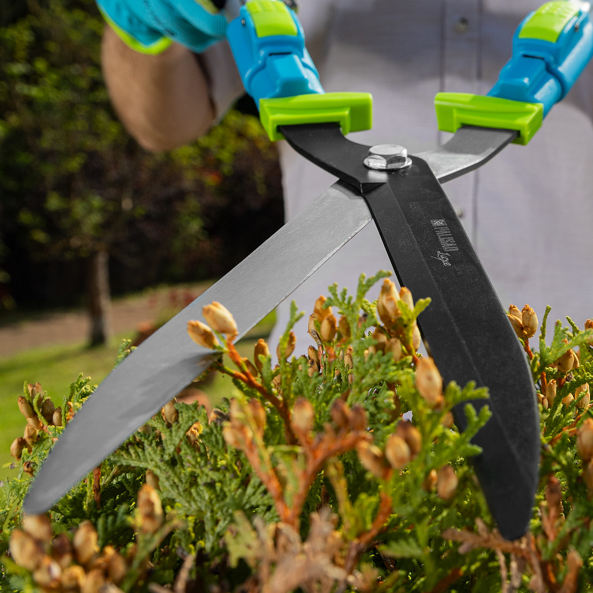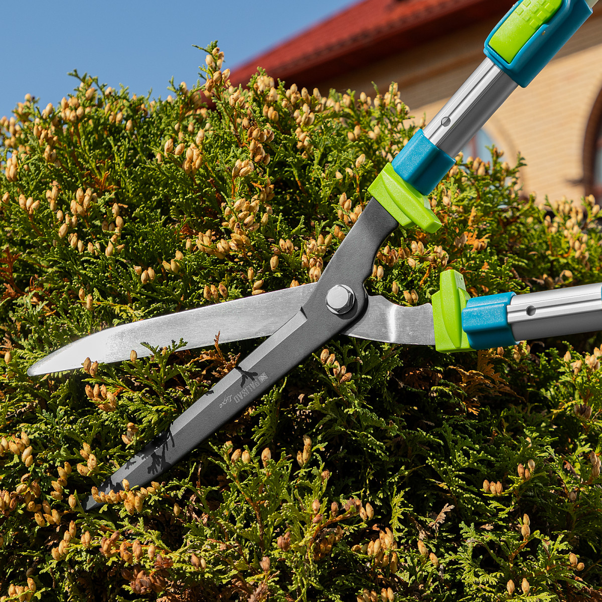 Кусторез Palisad LUXE 60592 с телескопическими алюминиевыми рукоятками, регулируемыми по длине от 640 до 820 мм, используется садоводами для стрижки кустов и живых изгородей на дачном участке. Успешно справляется с обрезкой молодых веток толщиной до 10 мм. Телескопические рукоятки облегчают работу на высоте и в труднодоступных местах.