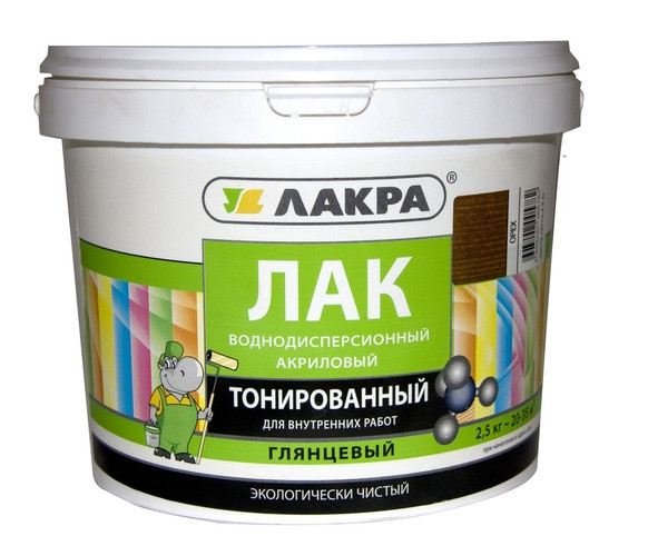 "Высококачественный лак на основе водной акриловой дисперсии. Придает деревянным поверхностям красивый декоративный вид. Обладает высокой скоростью высыхания, что дает возможность окрасить поверхность в 2 слоя за одни сутки.