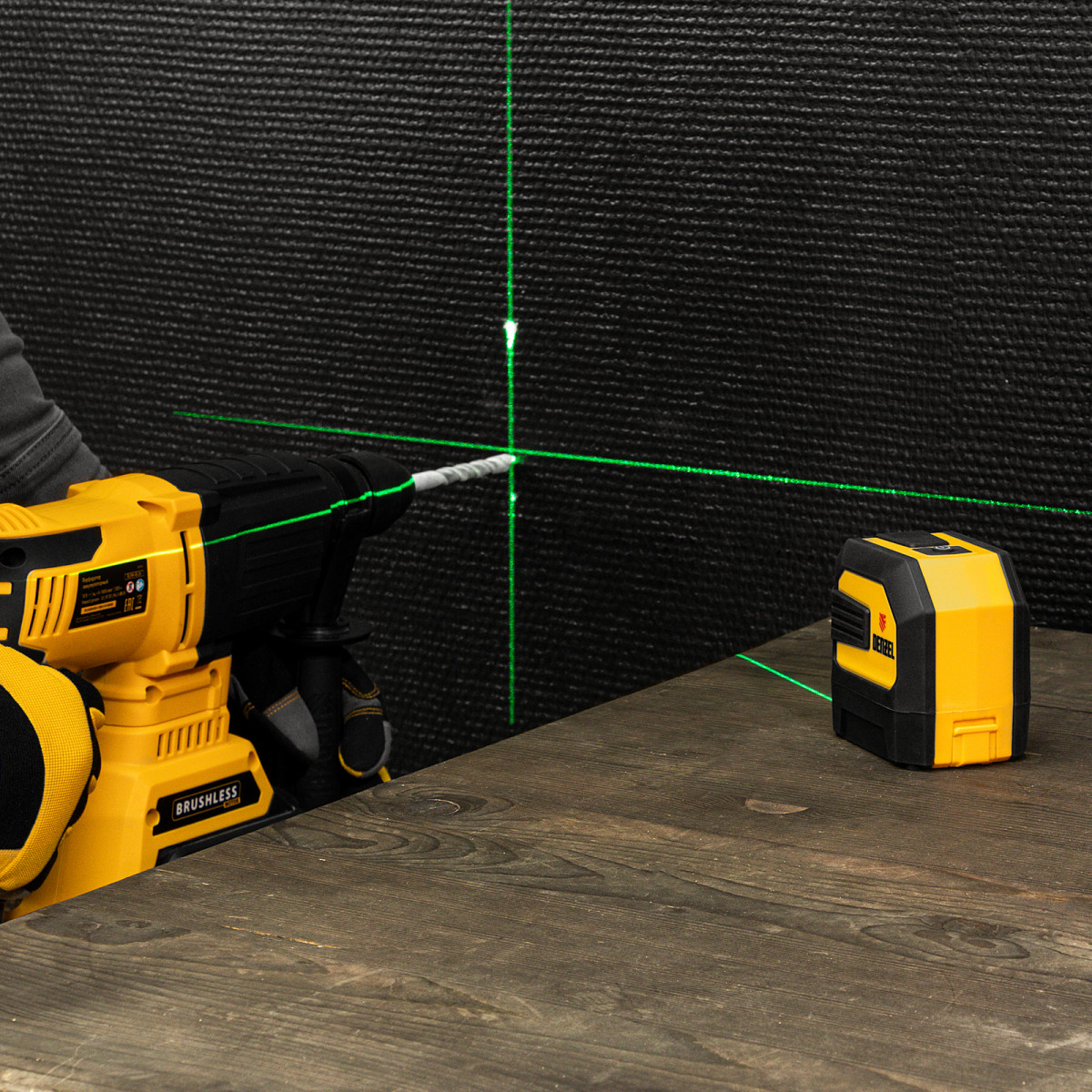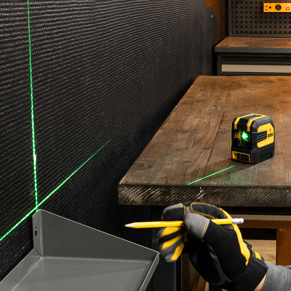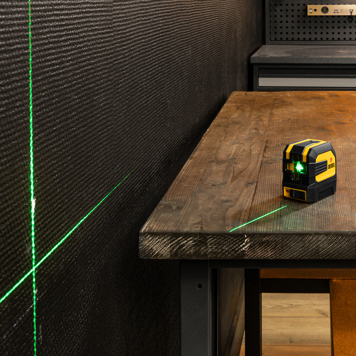 Лазерный уровень Denzel LX 03 35058 с резьбой 1/4" под штатив имеет точность ±0,3 мм/1 м и проецирует вертикальную и горизонтальную линию на расстояние до 30 м при помощи зеленых лучей 520 нм. Используется для построения разметки на стенах, полу и потолке. Пригодится во время укладки плитки, монтажа подвесных потолков, установки оконных рам, а также проведения других ремонтных и отделочных работ.
