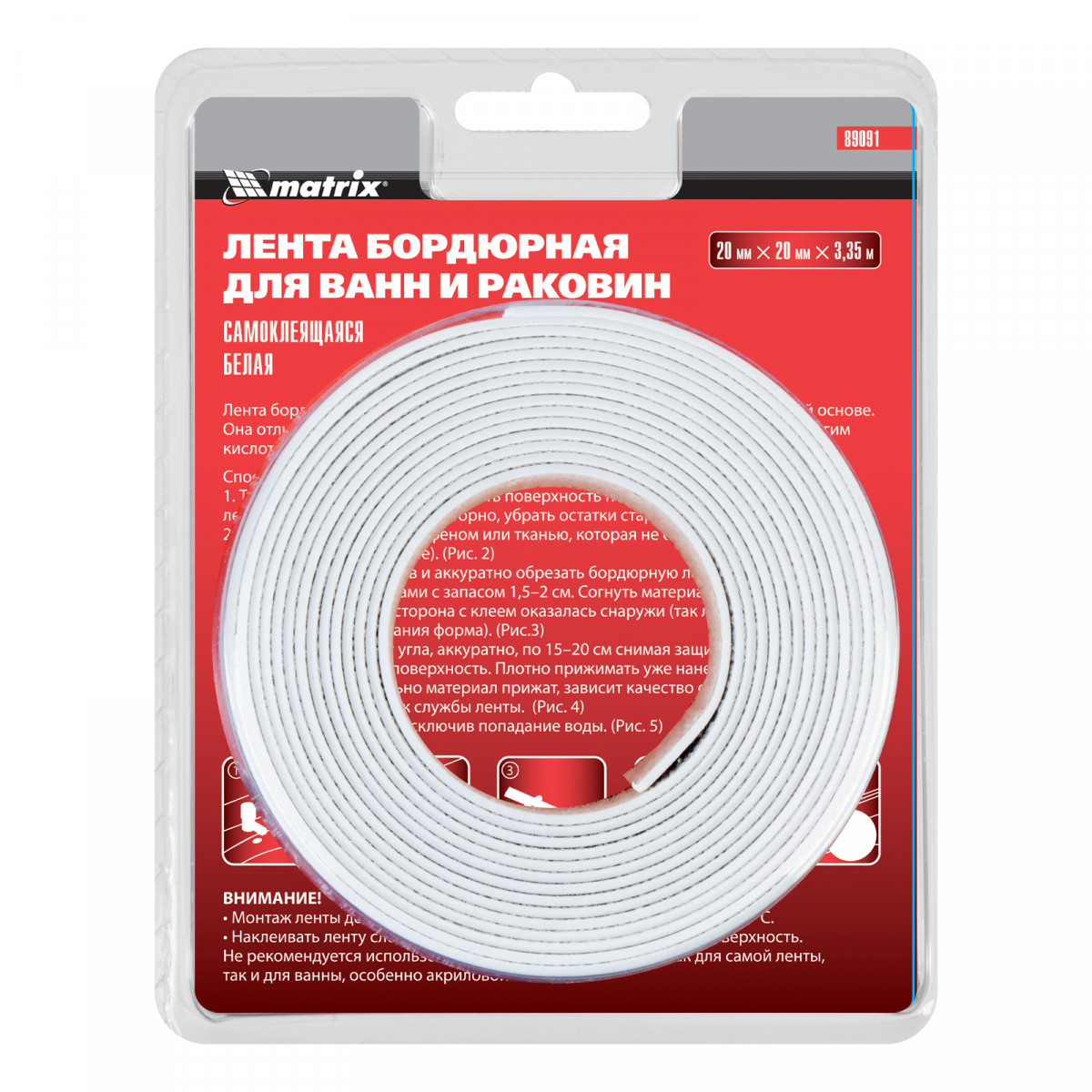 Бордюрная лента Matrix 89091 размером 20 мм х 20 мм х 3,35 м используется для герметизации швов ванн, раковин, столешниц, подходит для фиксации в углах и стыках стен. Надежно фиксируется на глянцевых поверхностях и выдерживает эксплуатацию в условиях повышенной влажности.