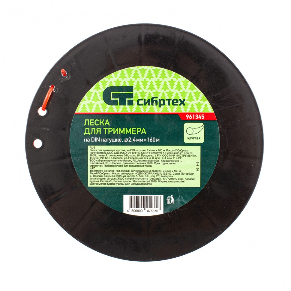 Леска для триммера круглая, на DIN катушке, 2.4 мм х 160 м, Сибртех