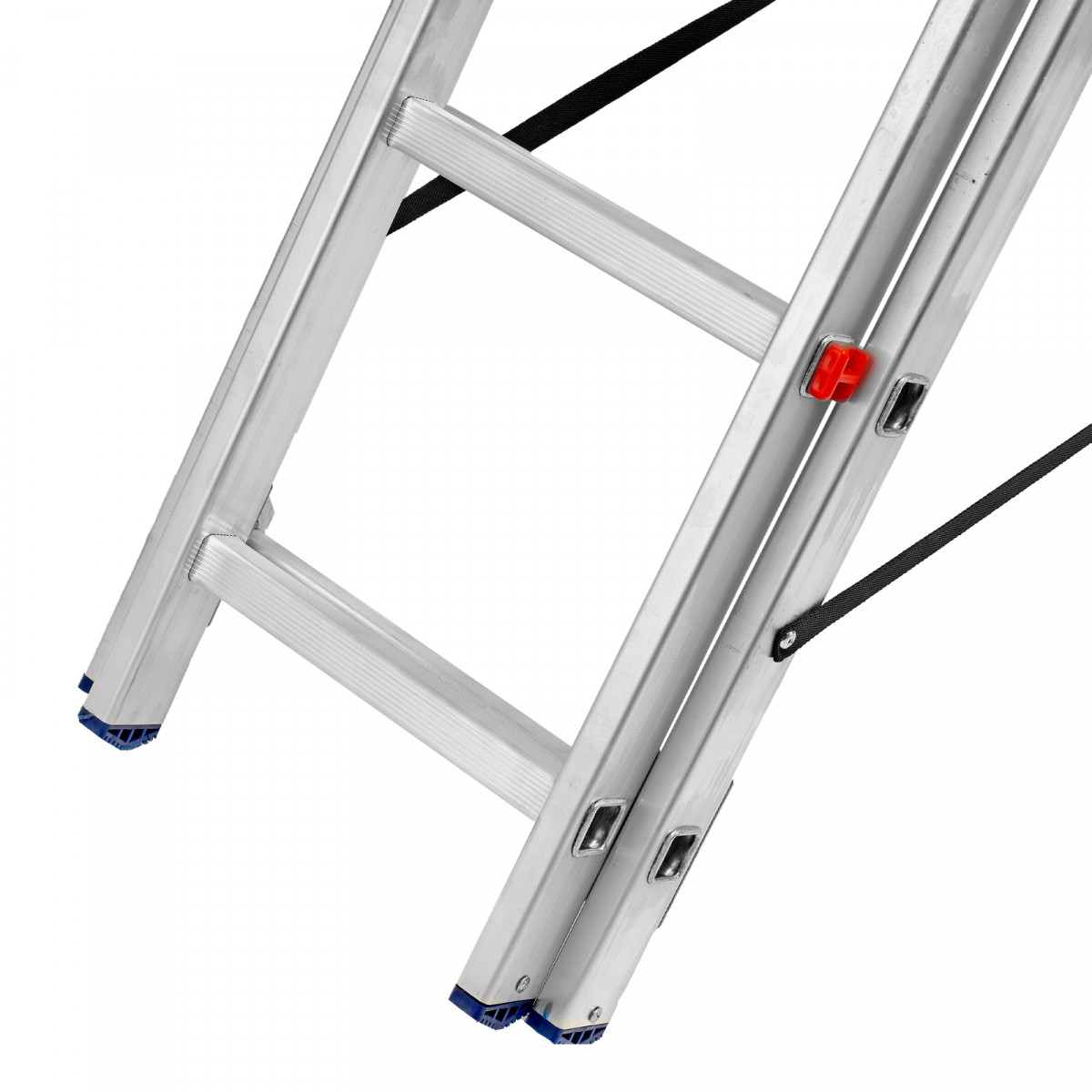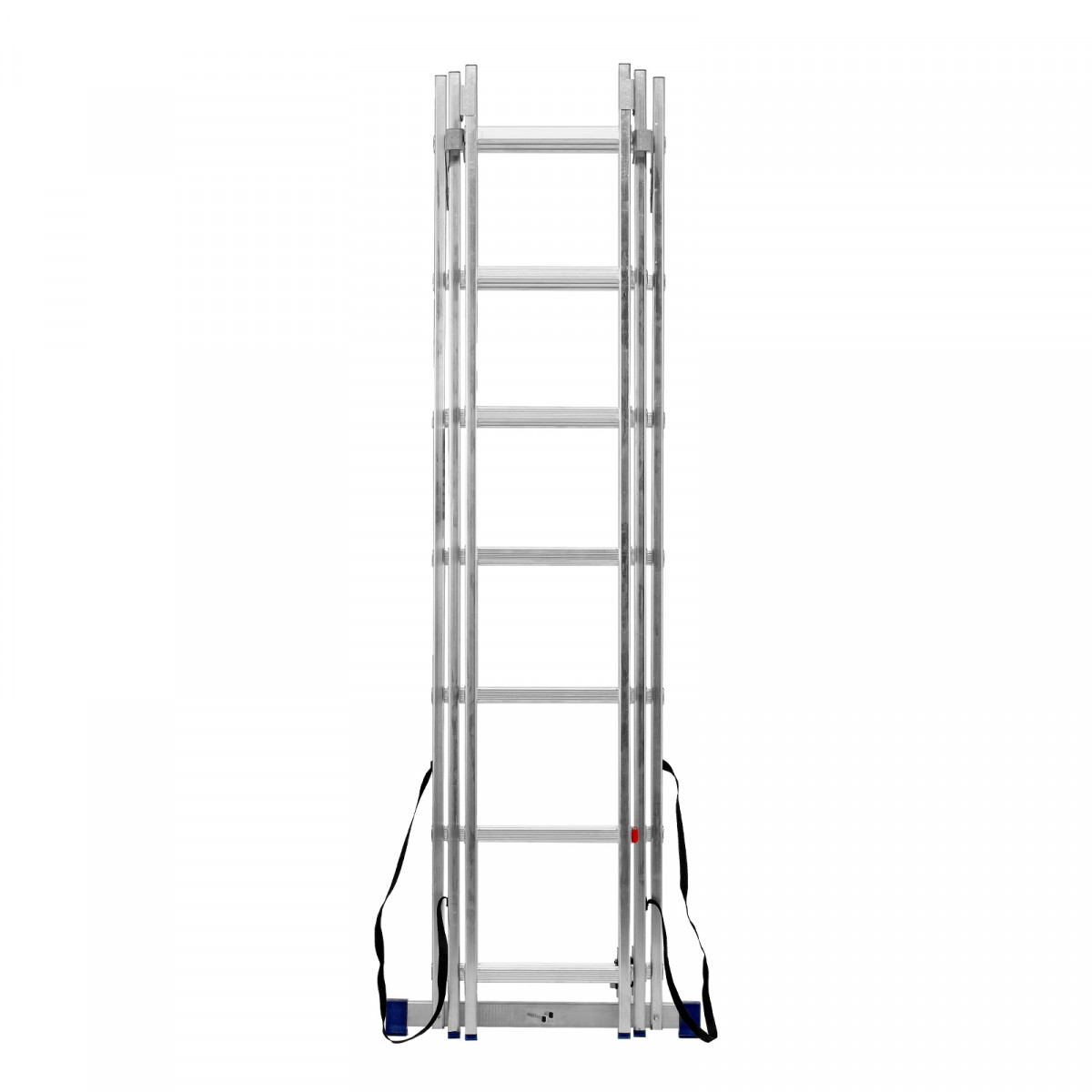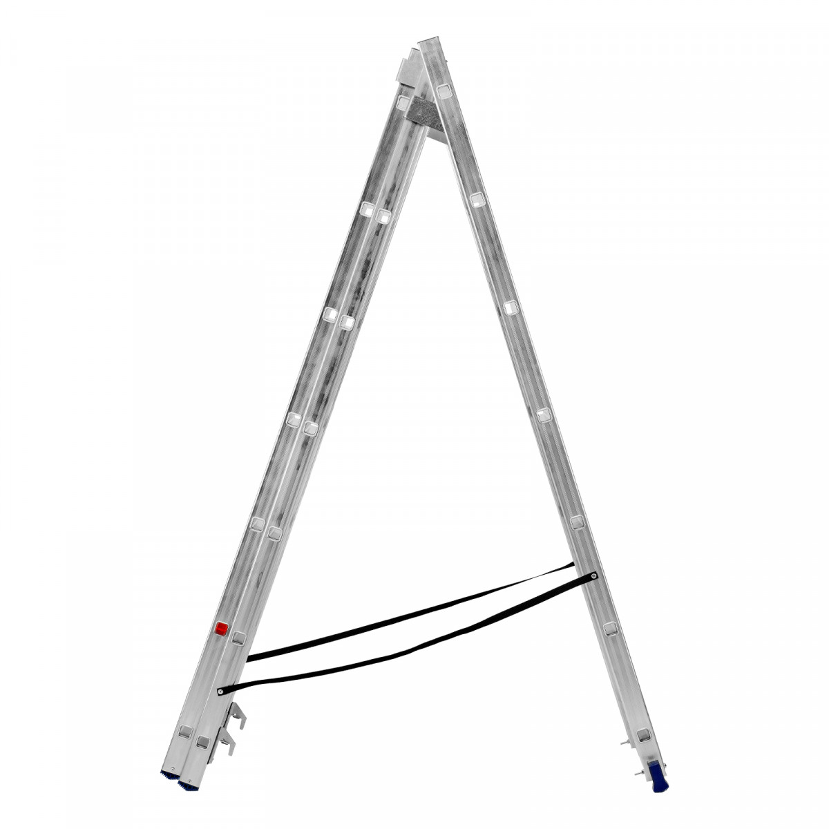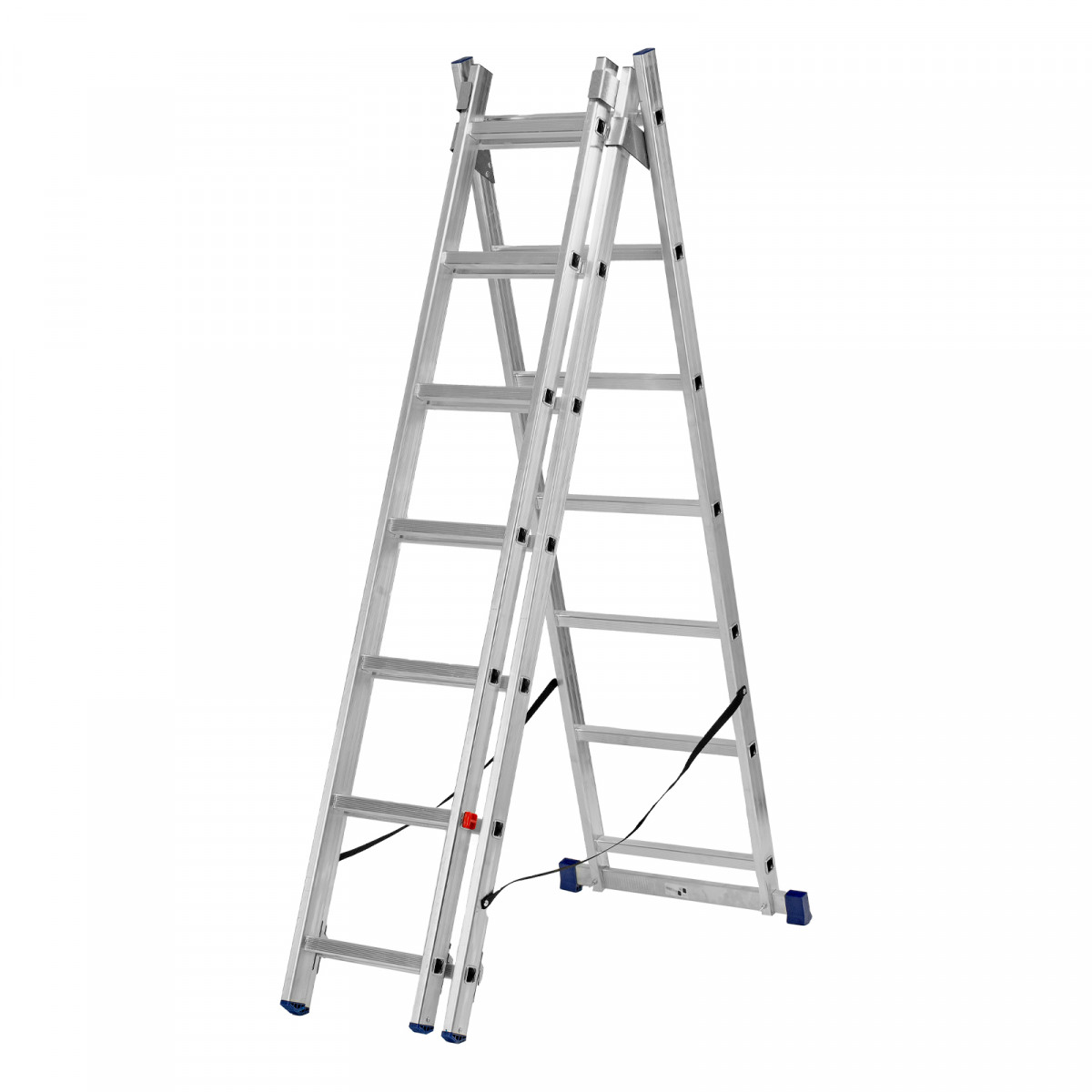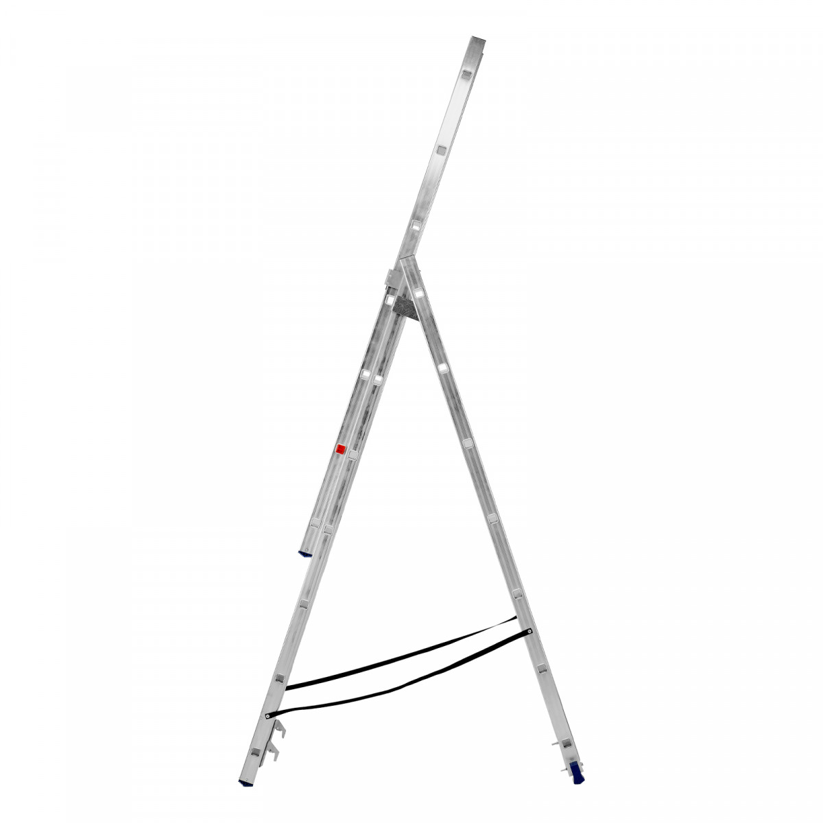- Многофункциональность — лестница может использоваться в 3 различных вариациях — в качестве стремянки (с двумя расставленными и одной выдвинутой вверх секцией), двухсторонней стремянки (две секции расставлены, третья демонтирована) и приставной лестницы.