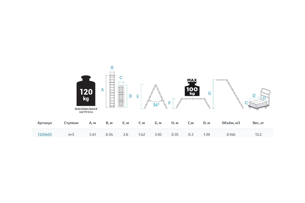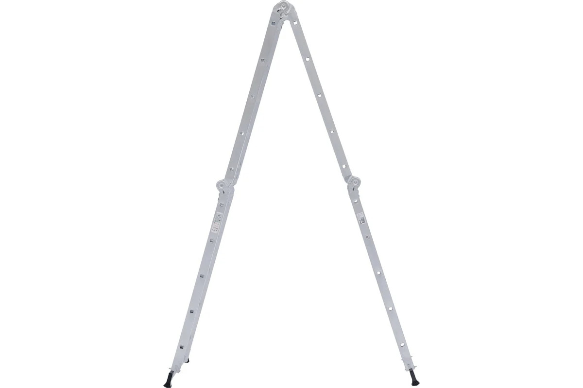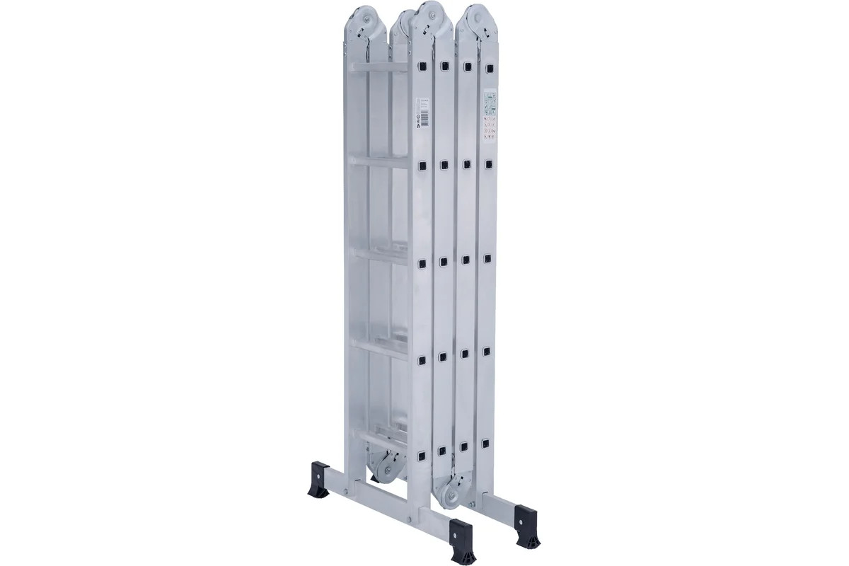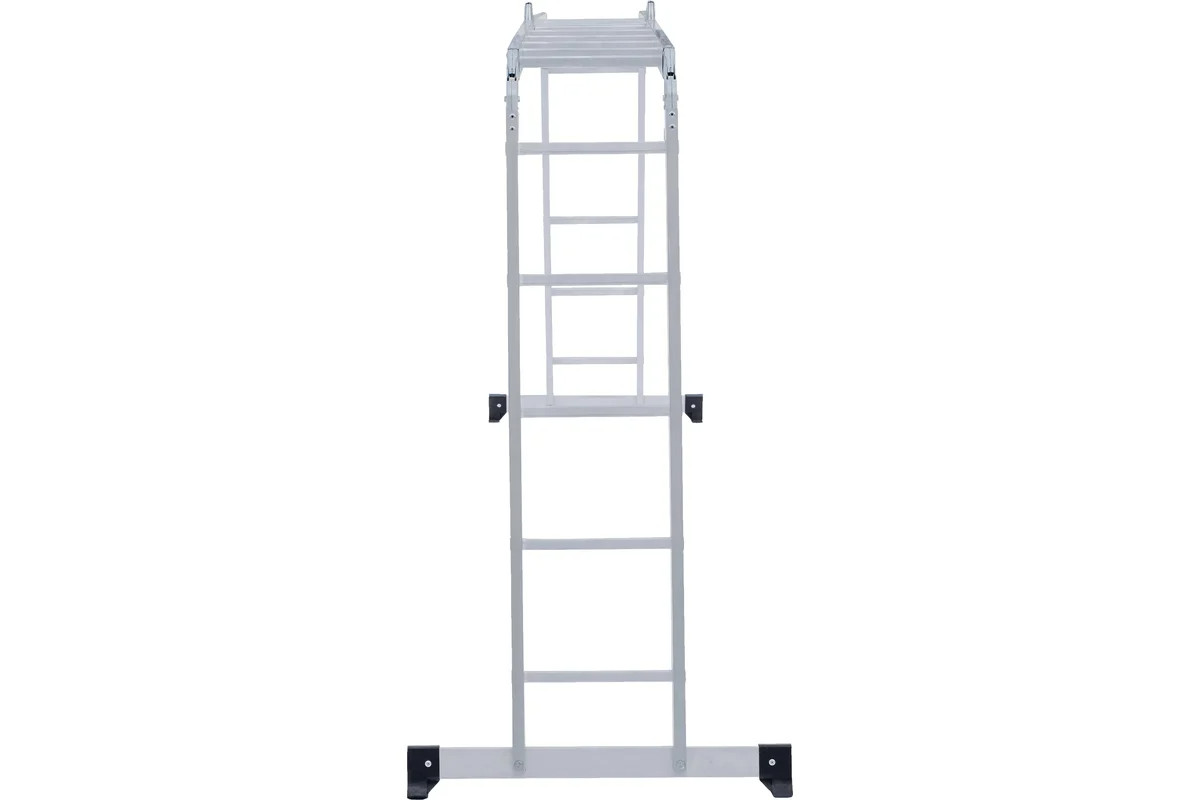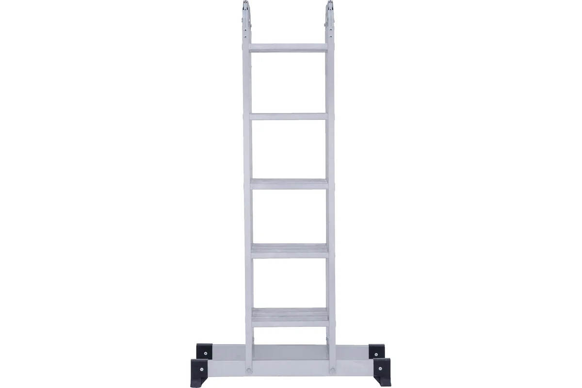 Четырехсекционная лестница-трансформер Новая Высота 4х5 1320405 предназначена для бытового использования. Легко трансформируется в помост, стремянку, приставную лестницу, лестницу с выносом. Оснащена стойками с дополнительным усилением в наиболее нагруженных местах для повышения жесткости. Шарнирные замки регулируются одной рукой. Благодаря многократной развальцовке в соединении ступеней со стойками изделие имеет долгий срок службы.
