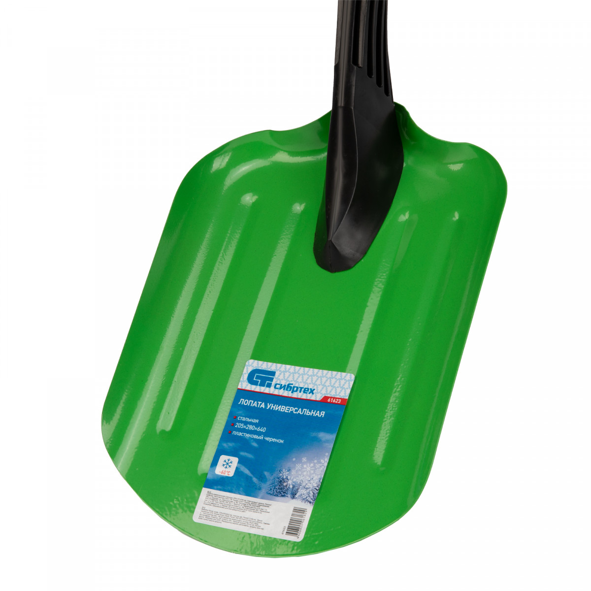 Универсальная стальная лопата Сибртех 61623 размером 205 х 280 х 640 мм, с пластиковым черенком, будет полезна автомобилистам, дачникам и строителям. Ее можно использовать для чистки снега на небольших участках и для погрузки сыпучих материалов. Благодаря пластиковому черенку инструмент весит всего 522 г, поэтому с ним легко справится любой пользователь.
