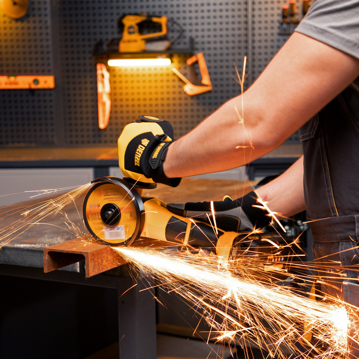 - Быстрая замена оснастки — конструкцией предусмотрена блокировка шпинделя и бесключевое крепление защитного кожуха.